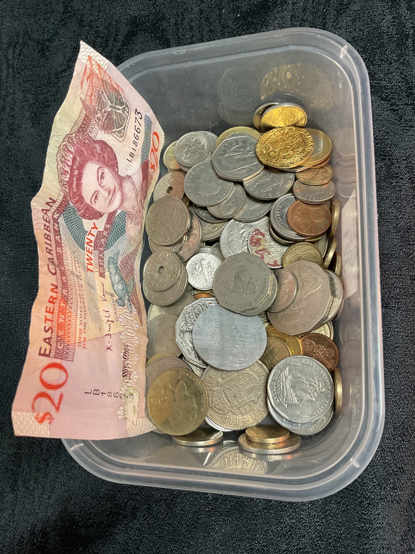 This lot comprises a collection of Caribbean coins and a single Eastern Caribbean banknote. The coins appear to be of various denominations and ages, offering a glimpse into the region’s monetary history. The banknote is a twenty-dollar bill, displaying vibrant colours and intricate designs typical of Caribbean currency.