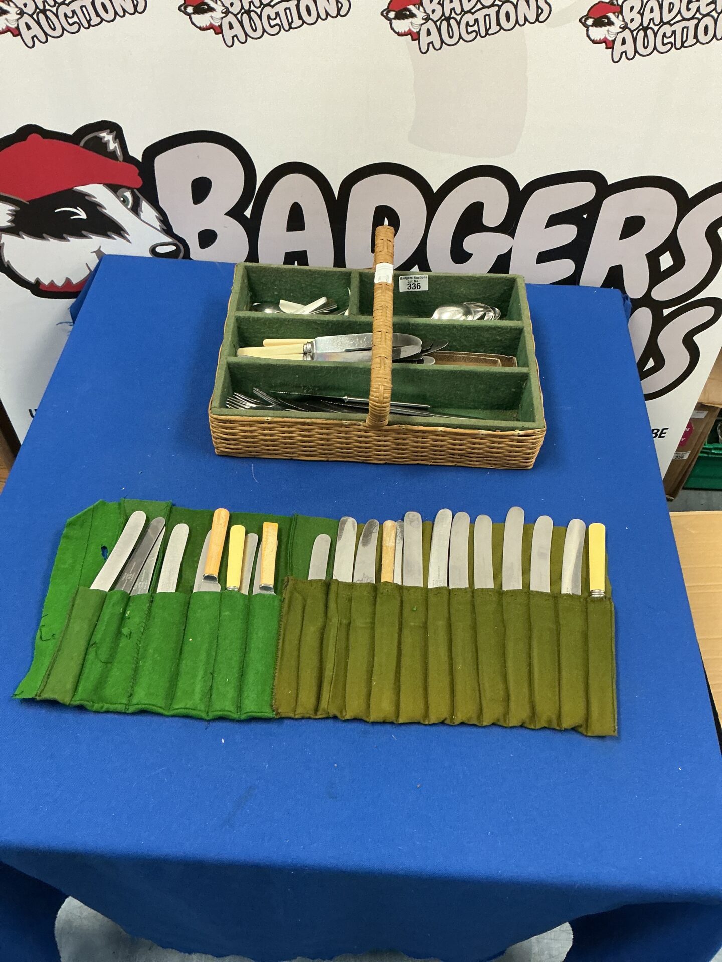 This tray presents a diverse collection of cutlery items, encompassing various styles and materials. The selection includes forks, knives, and spoons, some appearing to be silver plate and others stainless steel. This assortment suggests a compilation from different sets or periods, offering a charmingly eclectic mix for collectors or those seeking a unique table setting.