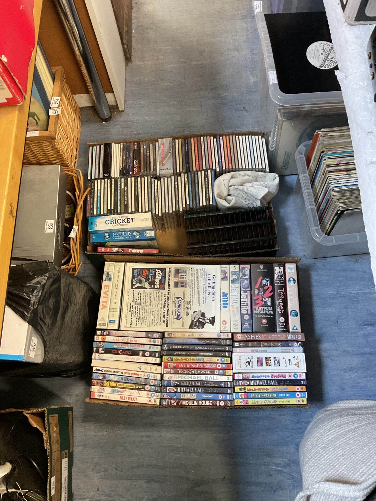 This lot comprises a collection of DVDs and CDs, offering a variety of entertainment options. The collection appears to be a mixed assortment of genres, potentially including movies, music albums, and possibly other media formats. The lot is presented as-found, offering a glimpse into a previously enjoyed collection.