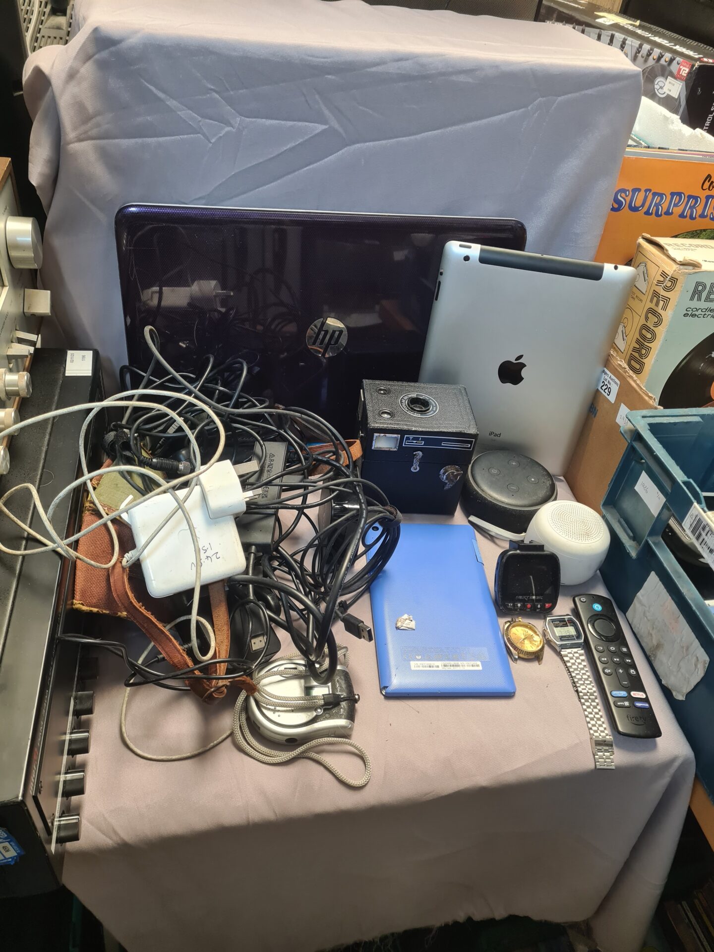 This mixed electrical lot includes an Amazon Alexa, Apple iPad, Firestick remote, and several watches. The items are offered as a collection, with no guarantee of functionality. Ideal for collectors, repair enthusiasts, or those seeking spare parts.