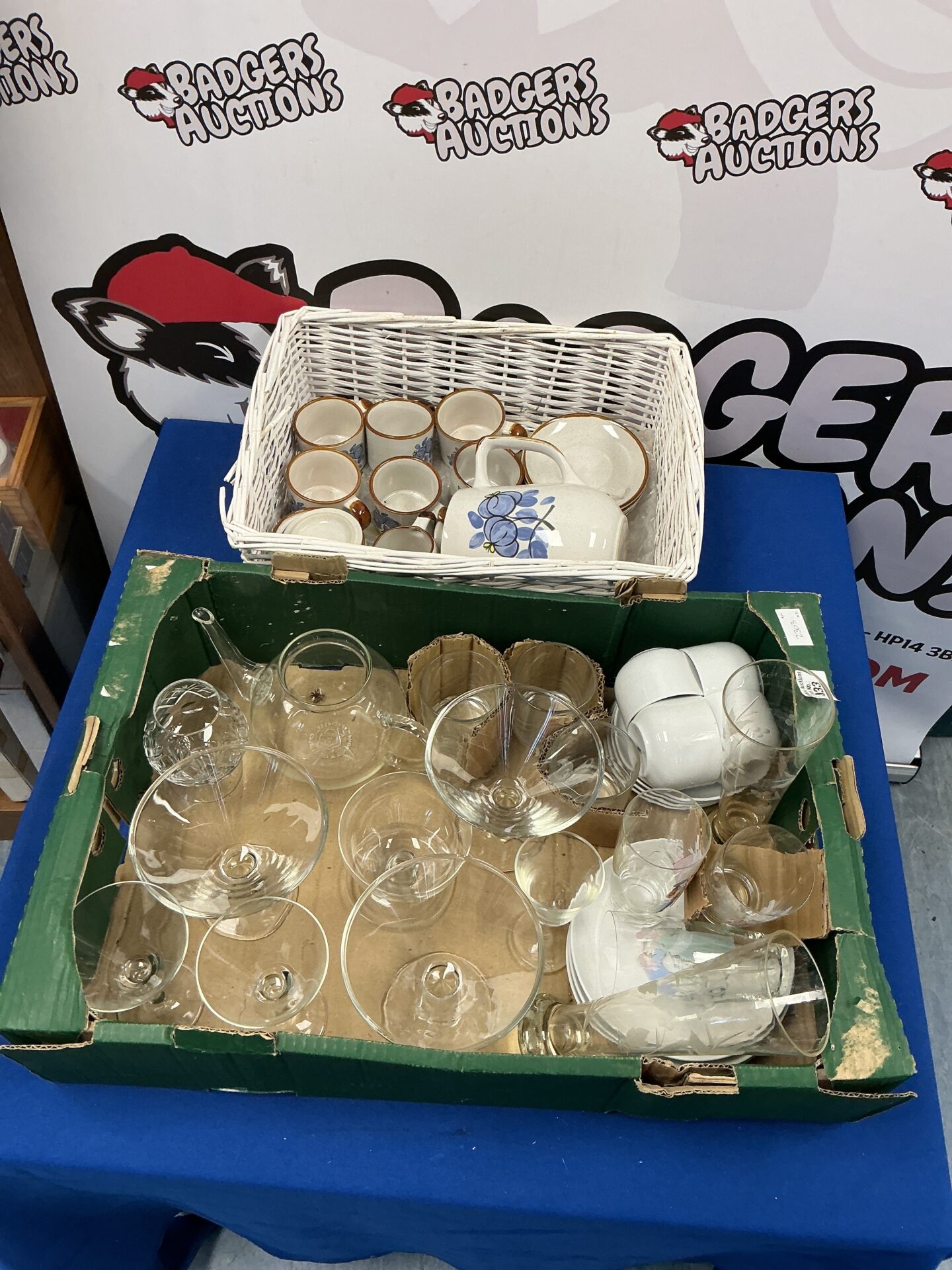 This lot comprises a collection of mixed glass and pottery items. The assortment includes various sizes and styles of glassware, alongside a selection of ceramic pieces. The collection appears to be a varied mix of decorative and potentially functional items, offering a diverse range for collectors or those seeking unique home décor.