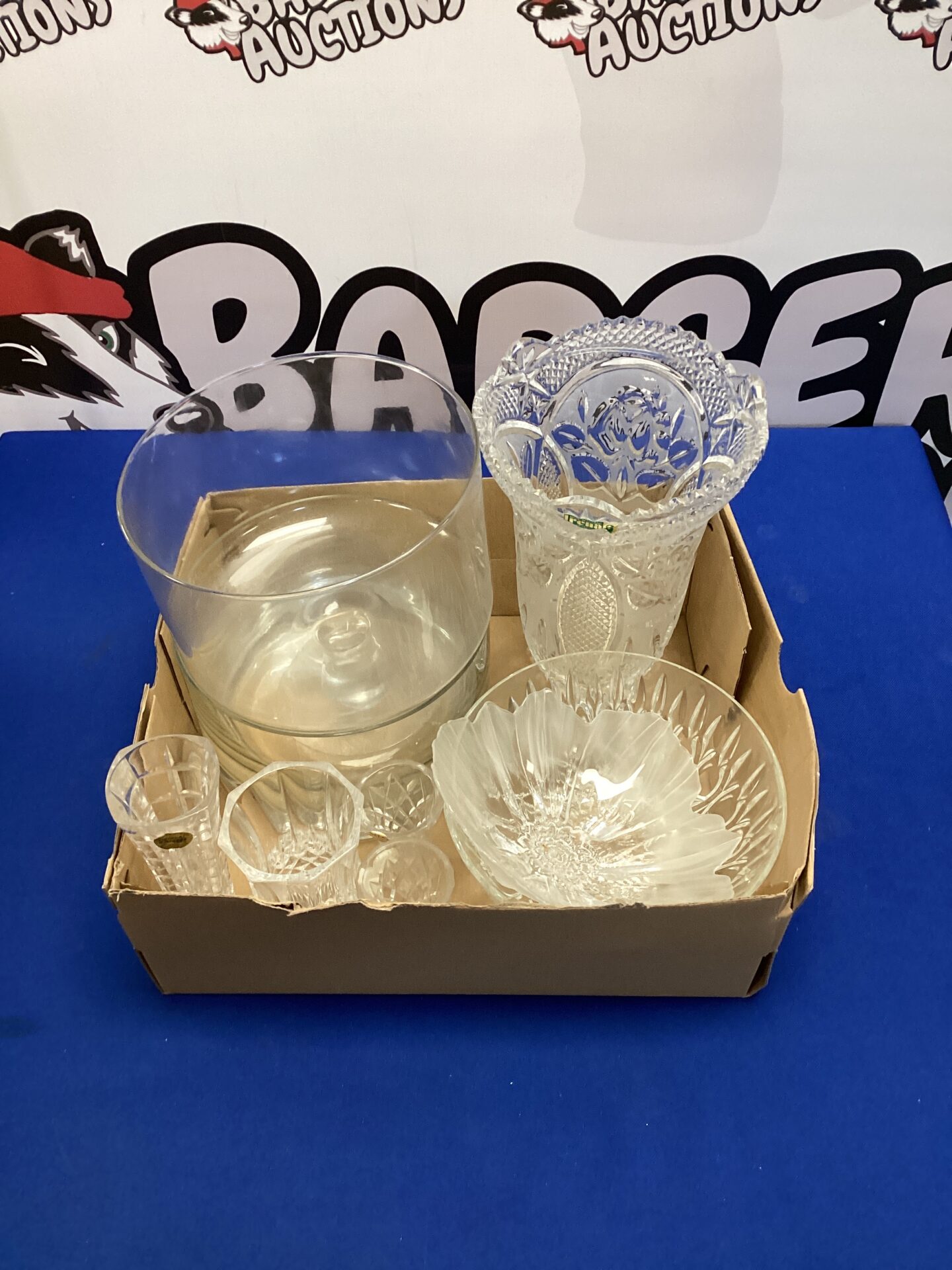 This lot comprises a collection of assorted glassware pieces, including vases and bowls. The pieces exhibit varied designs and shapes, suggesting a decorative purpose. The collection appears to be a mix of styles, potentially spanning different eras, and would suit a collector or someone looking to add a touch of elegance to their home.