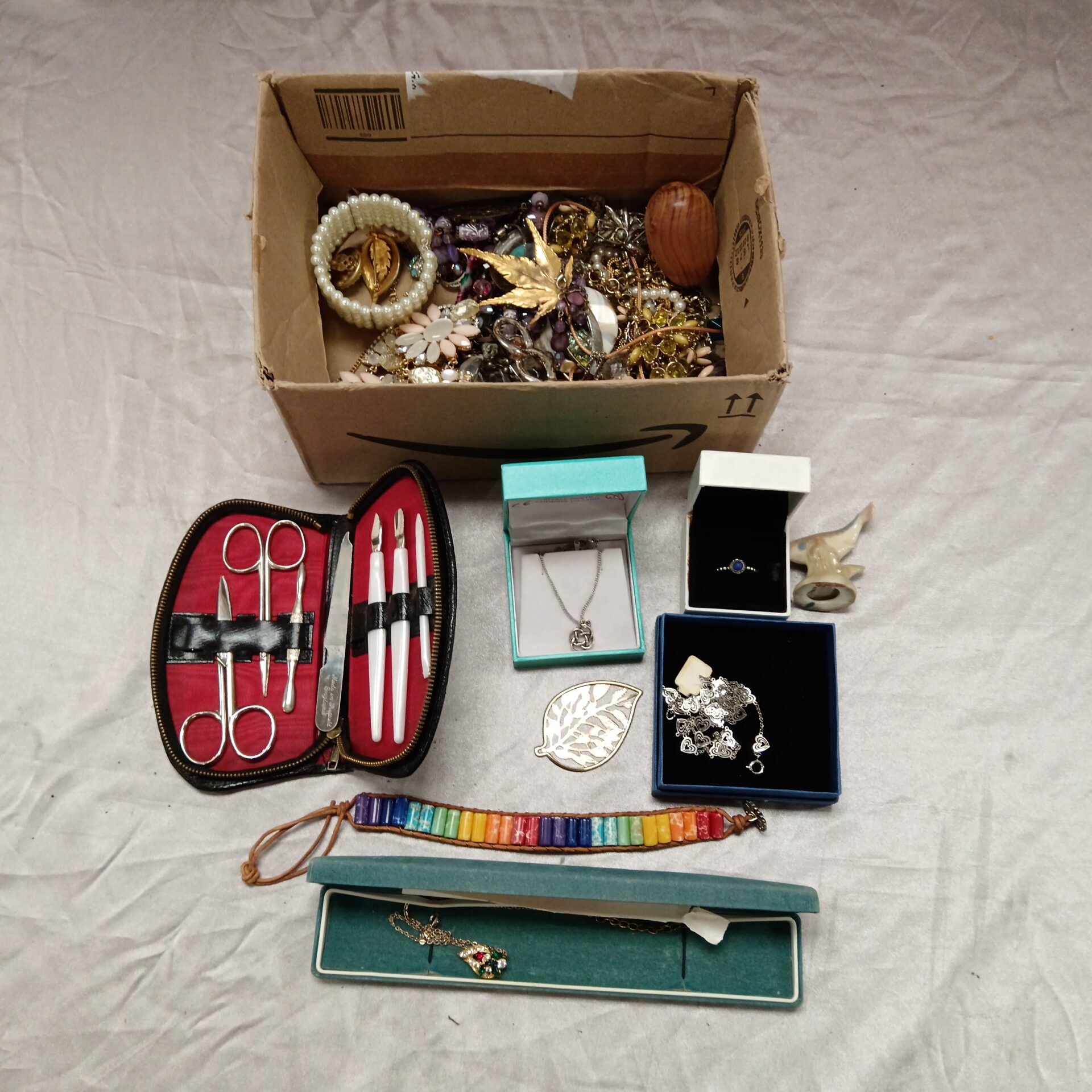 This lot comprises a diverse collection of fashion jewellery pieces. The assortment includes necklaces, bracelets, rings, and earrings, featuring a variety of materials such as beads, metal alloys, and potentially silver plating. A notable inclusion is a Pandora-style ring, adding a touch of branded appeal to the collection.