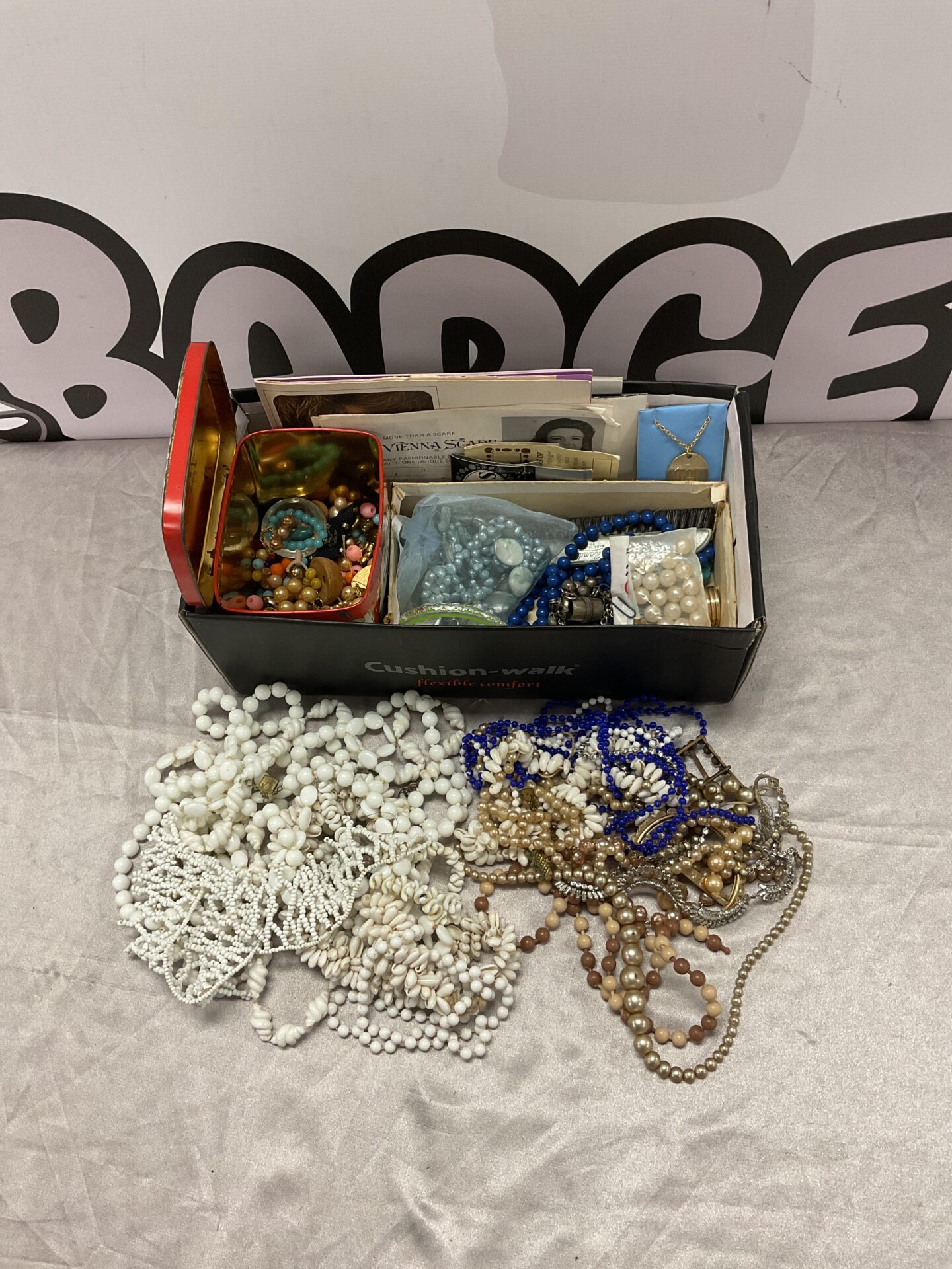 The jewellery presents as a mixed lot with varying conditions. Some pieces may exhibit wear consistent with age and use, such as minor discolouration or loss of beads. This lot would appeal to collectors of vintage costume jewellery, those seeking materials for crafting or repurposing, or individuals looking for a diverse selection of affordable accessories.