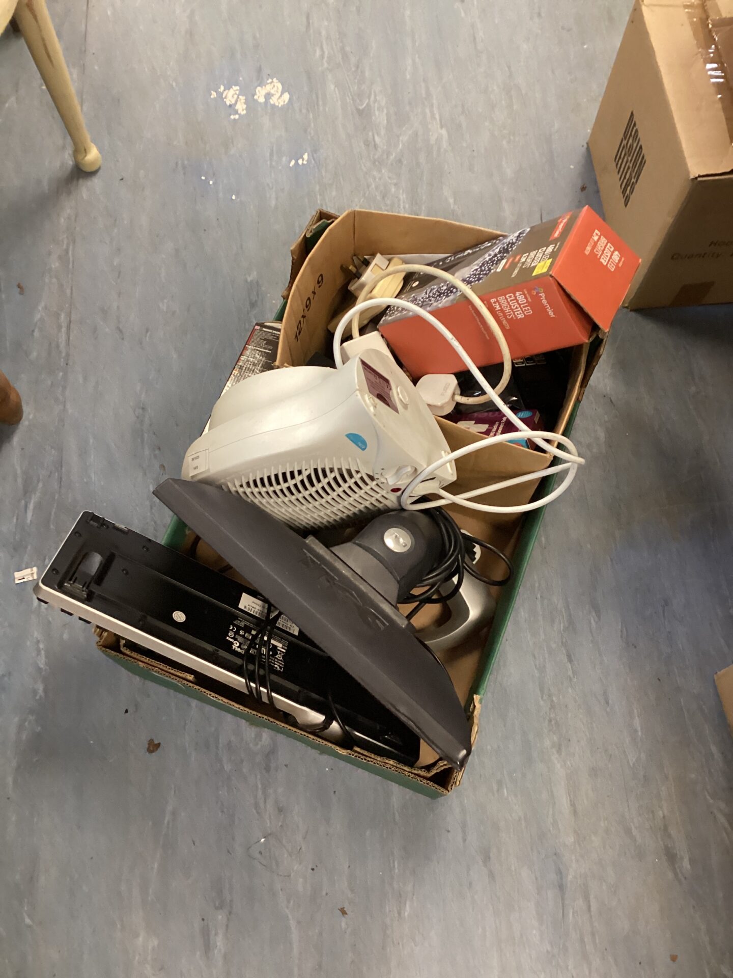 This mixed lot bundle contains a variety of household items, including a computer keyboard, a small electric heater fan, and a set of Christmas lights. The keyboard appears to be a standard QWERTY layout, suitable for general computer use. The heater fan is a compact unit, ideal for providing localised warmth, and the Christmas lights are perfect for adding a festive touch to any home during the holiday season.