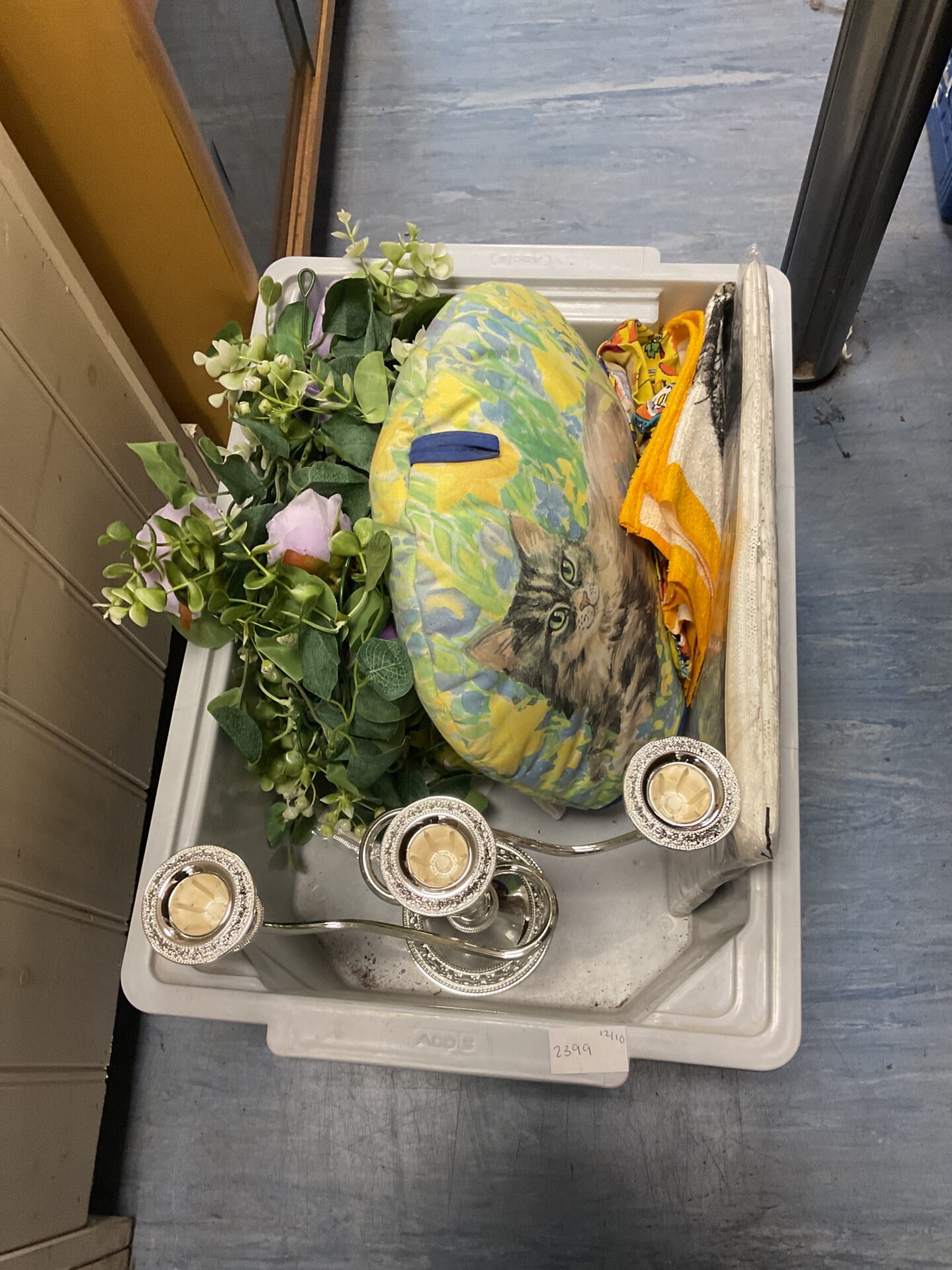 This mixed lot features a collection of vintage candelabra alongside a charming cat-themed cushion. The candelabra appear to be crafted from silver-toned metal, exhibiting a classic design suitable for pillar candles. The cushion is brightly coloured, featuring a detailed image of a cat, and adds a touch of whimsy to the collection.