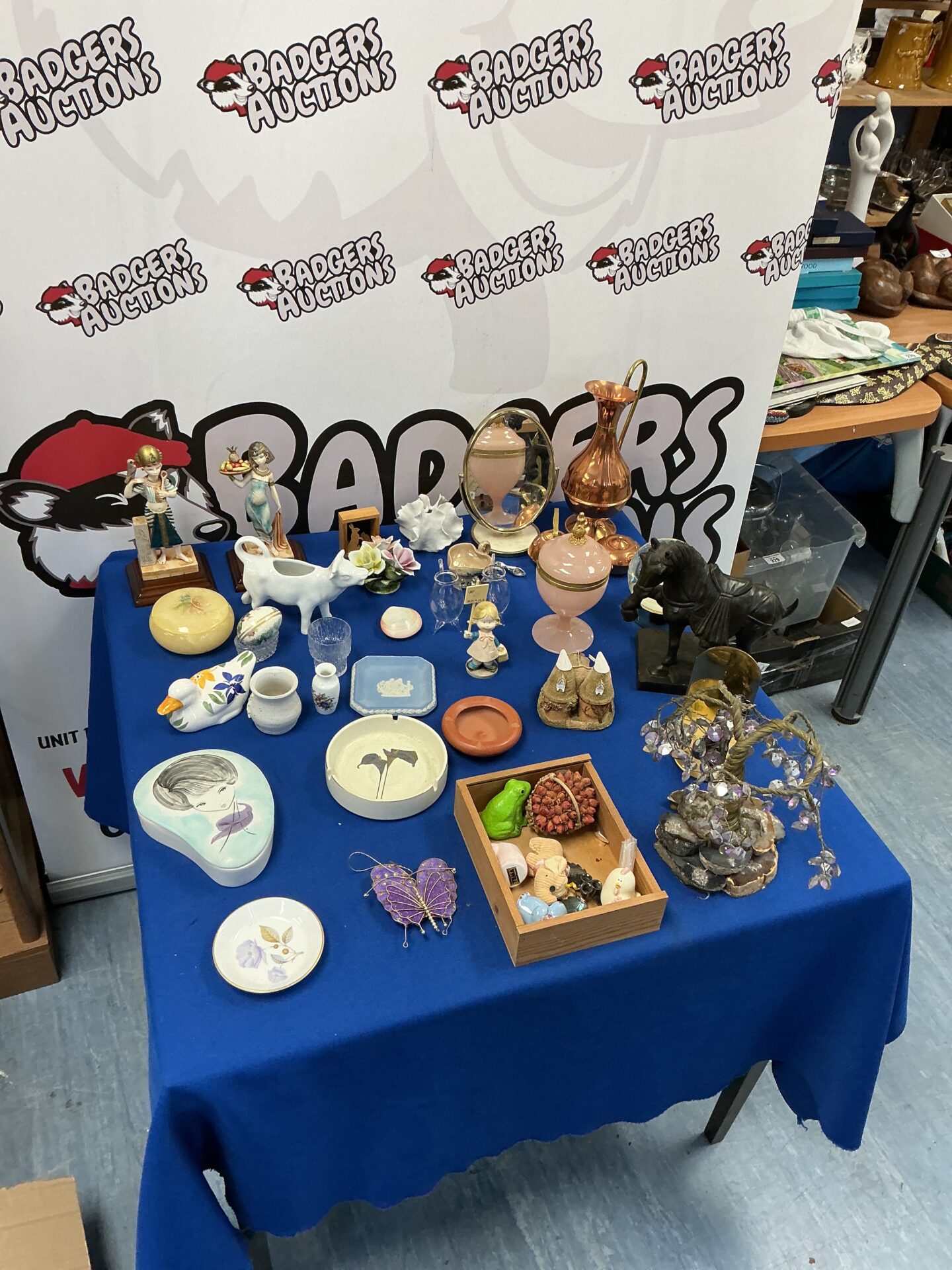 This diverse mixed lot presents a charming collection of vintage and decorative items. It includes a copper jug, likely used for serving water or milk, alongside several porcelain figures depicting birds and floral arrangements. The lot also features a selection of smaller curios and decorative pieces, offering a delightful assortment for collectors or those seeking unique home accents.