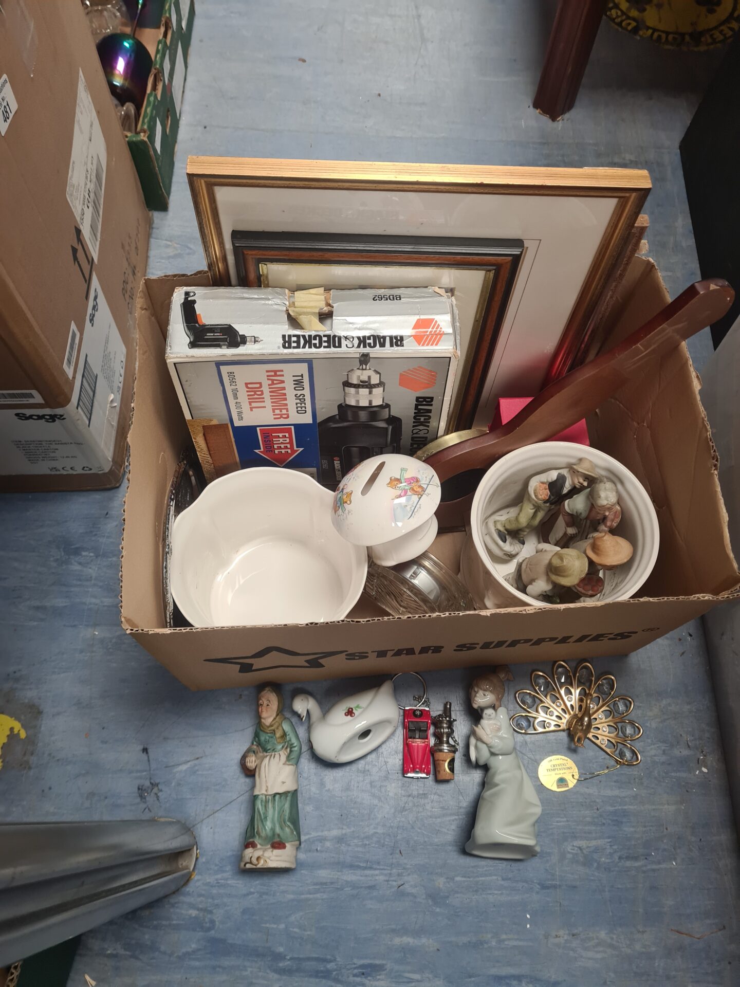 This mixed lot contains a variety of collectible items, including a barometer, a Lladro figurine, and a 24k gold-plated ornament. The lot also includes other decorative items, offering a diverse range of styles and materials. This assortment presents an opportunity to acquire several pieces for a collection or to repurpose them for home decor.