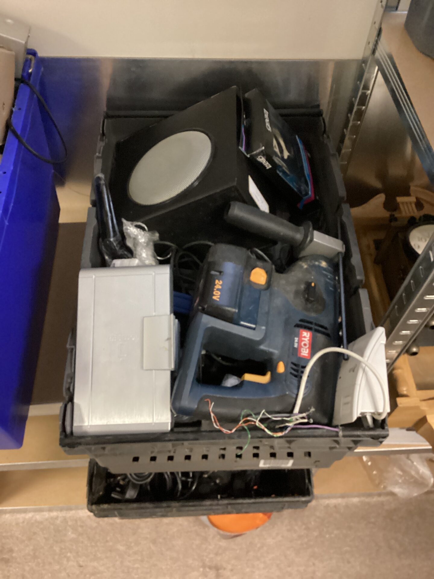 This lot comprises a selection of tools and electronics, including a Ryobi hammer drill, an Iomega external hard drive, and a Logitech subwoofer. The Ryobi drill appears to be a cordless model, designed for various drilling and fastening tasks. The Iomega drive offers external storage capabilities, while the Logitech subwoofer enhances audio experiences.