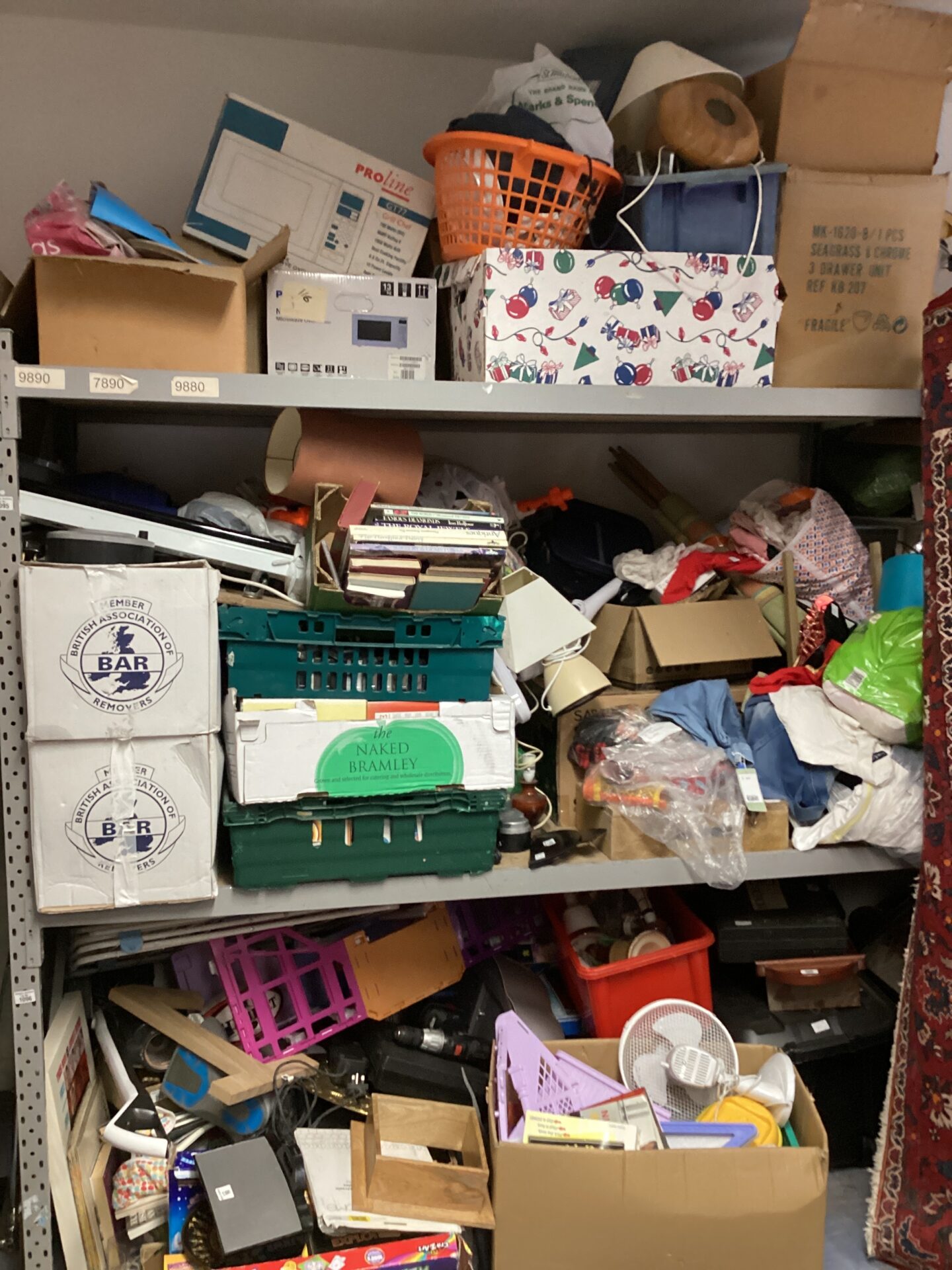 This lot comprises a collection of uncollected items from a storage area. It includes a variety of goods, such as books, audio cassettes, a lamp, and a law polisher. The items appear to be a diverse mix of household goods and collectibles, offering a varied selection for potential buyers.