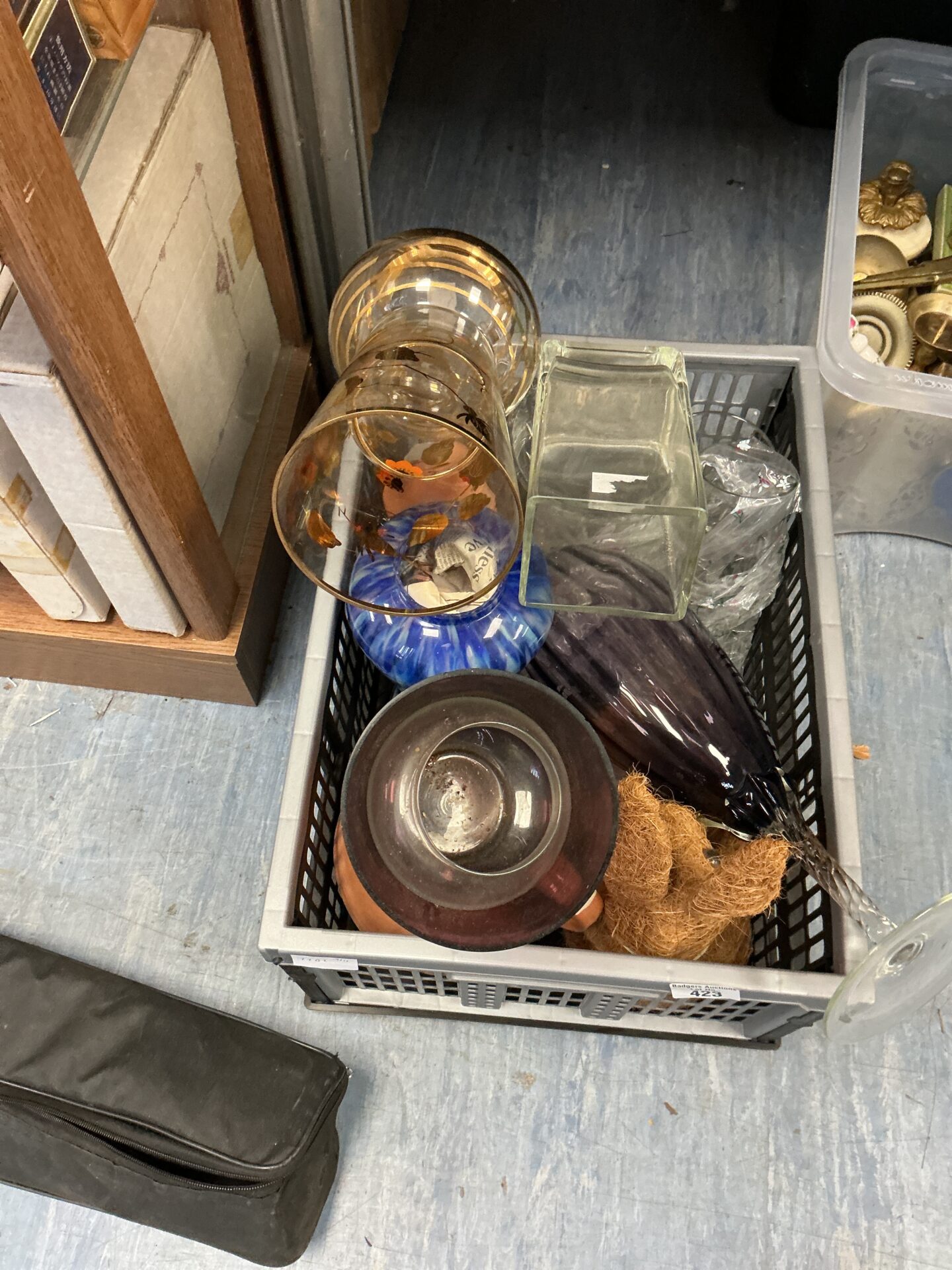 This lot comprises a selection of decorative vases, showcasing a variety of styles and materials. The collection includes a blue ceramic vase with intricate detailing, alongside a clear glass vase with a unique, flared shape. These vases represent a diverse range of aesthetic influences, potentially spanning several decades of design.