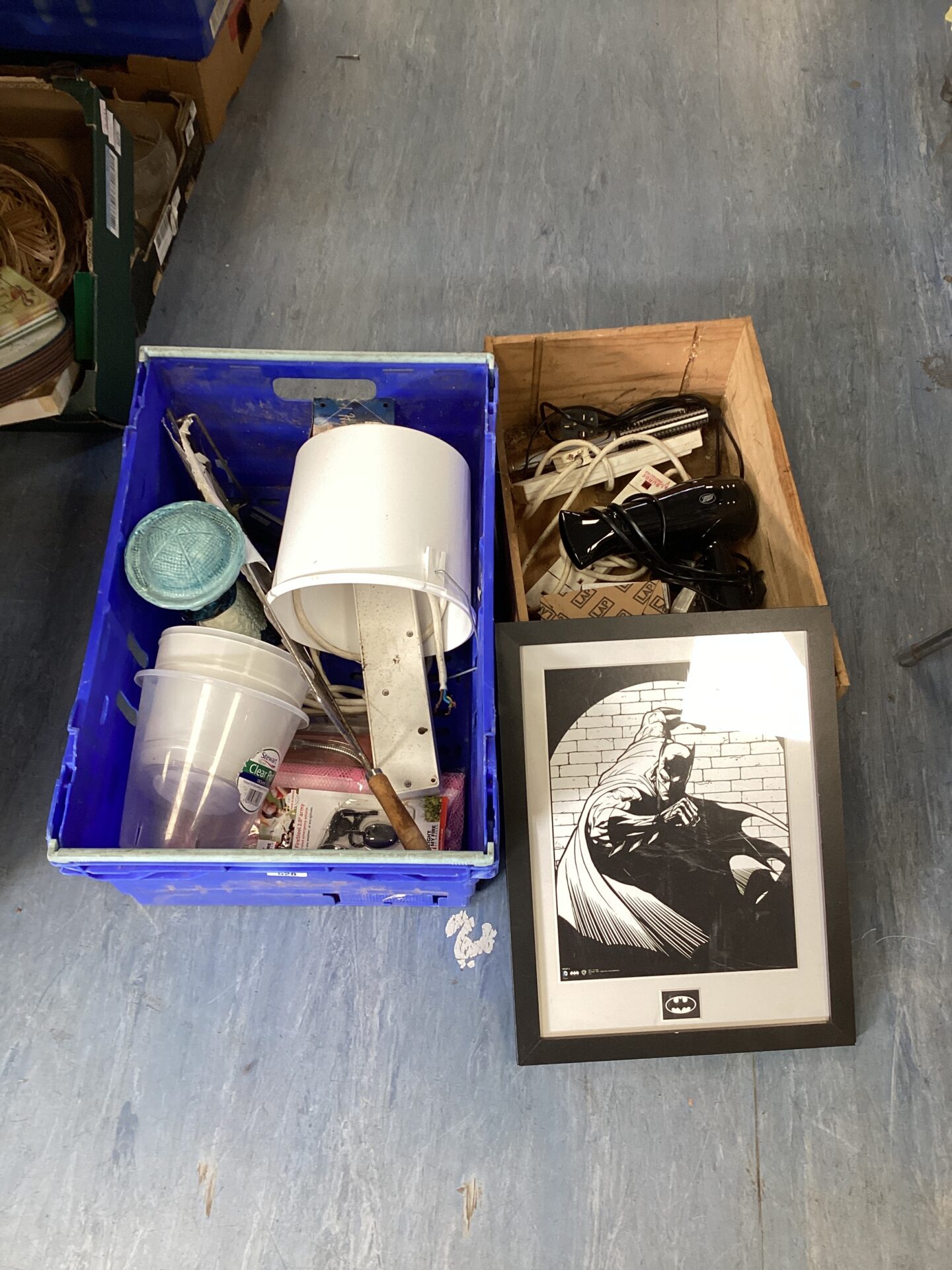 This mixed lot comprises a bundle of extension leads alongside a framed Batman art print. The print features a dynamic depiction of the iconic superhero, adding a touch of comic book flair to any space. The extension leads offer practical utility for various electrical needs around the home or workshop.