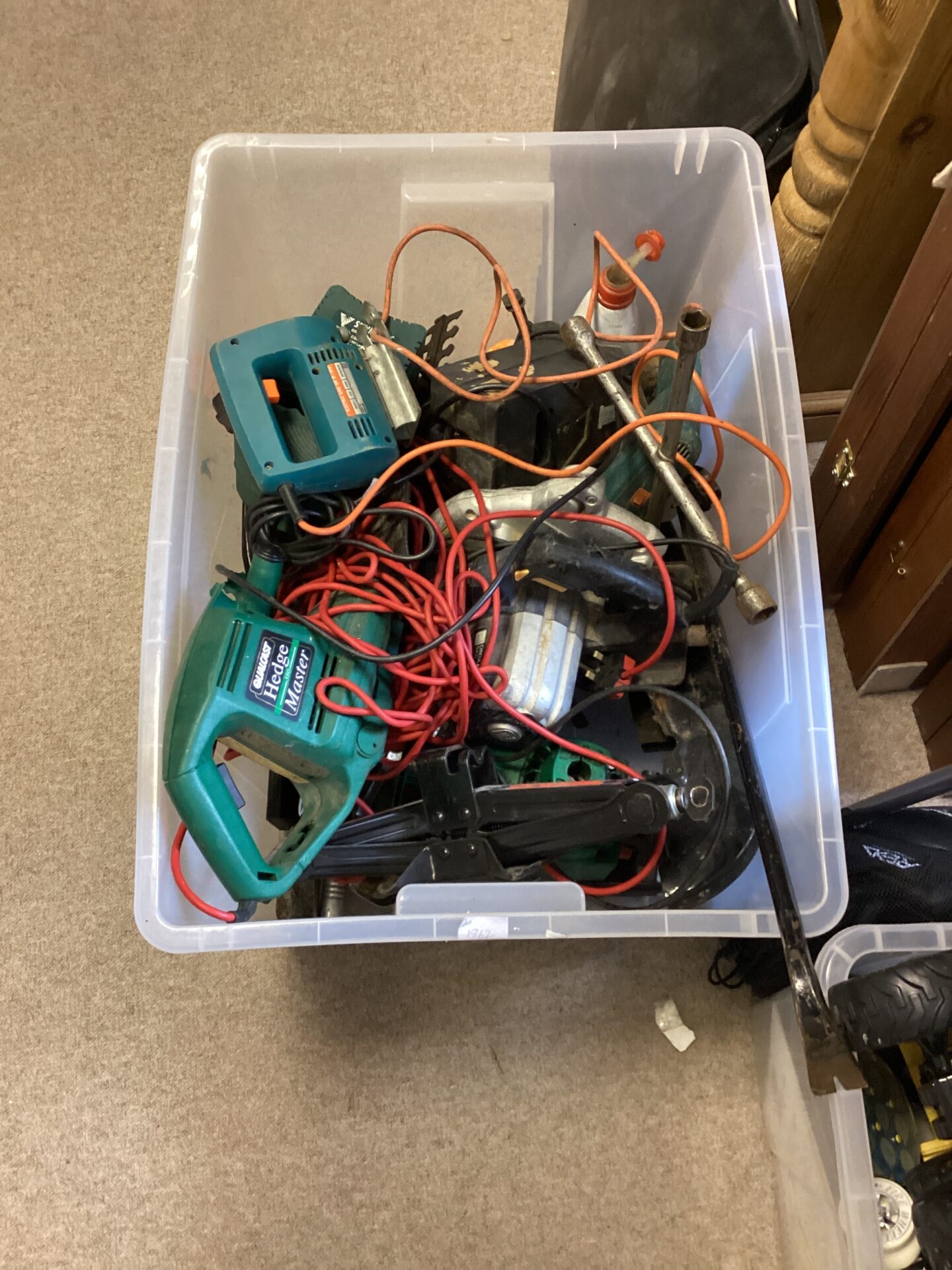 The tools are presented as a mixed lot, and their individual operational status is not assessed. This lot may appeal to collectors of vintage tools, those seeking parts for repair projects, or individuals looking to expand their workshop with a diverse range of implements. The crate format suggests a convenient way to transport and store the tools.