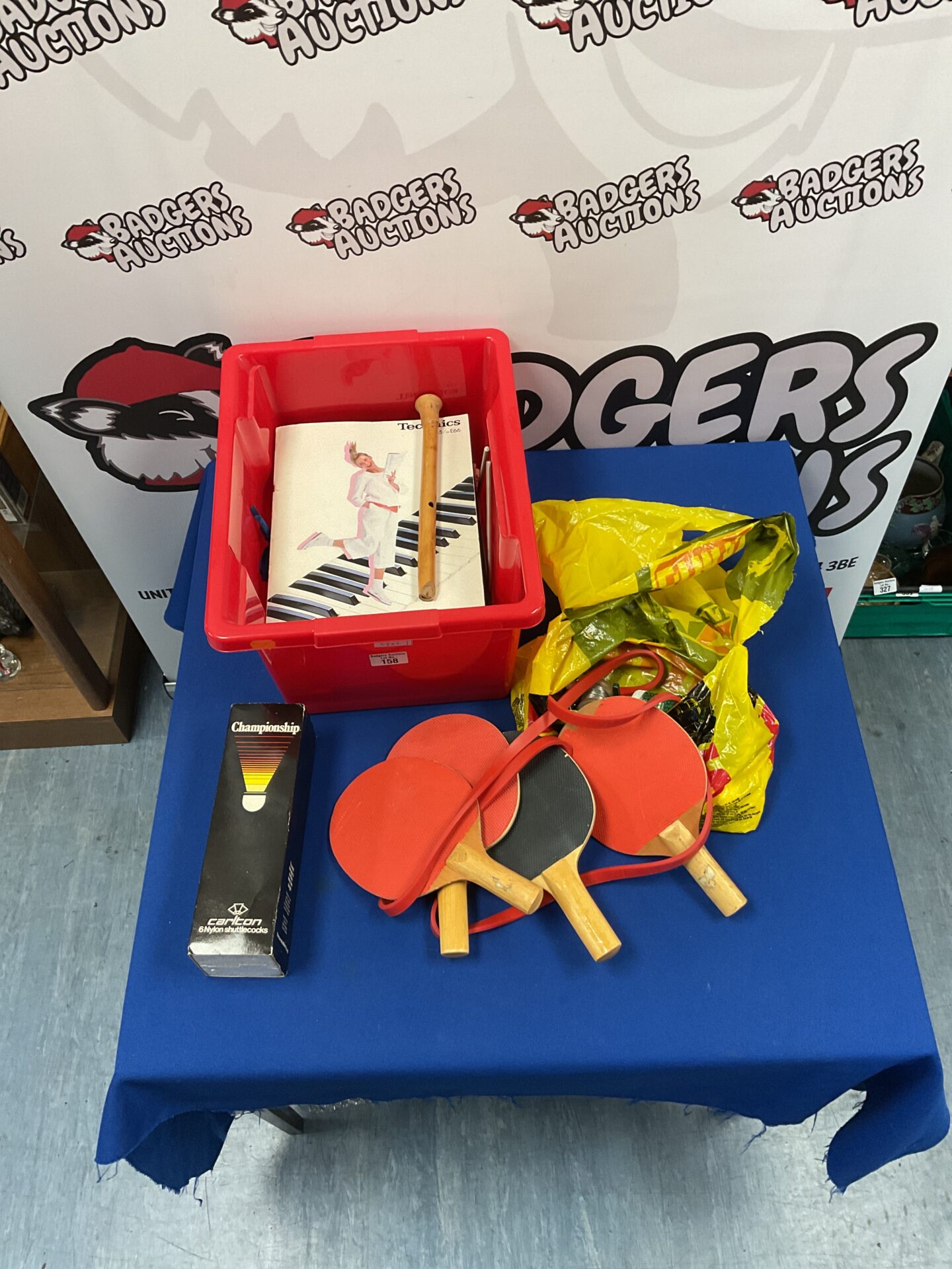 This lot comprises a collection of sporting and leisure items, including several ping pong racquets and a quantity of shuttlecocks, suggesting a focus on racket sports. Additionally, the lot includes sheet music, indicating a potential interest in musical pursuits. This varied collection offers a glimpse into a diverse range of hobbies and activities.