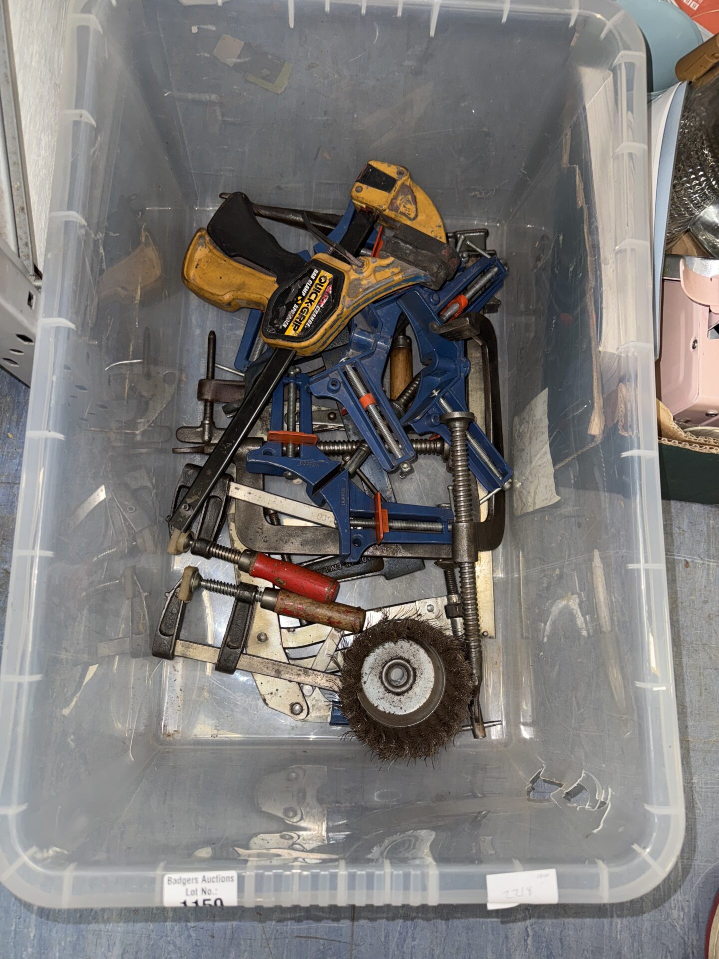 This mixed lot contains a variety of hand tools, including several clamps and a wire wheel attachment. The assortment appears to be geared towards DIY projects and workshop use. While the exact brands and models are varied, the lot offers a useful collection for a hobbyist or someone starting out with home repairs.