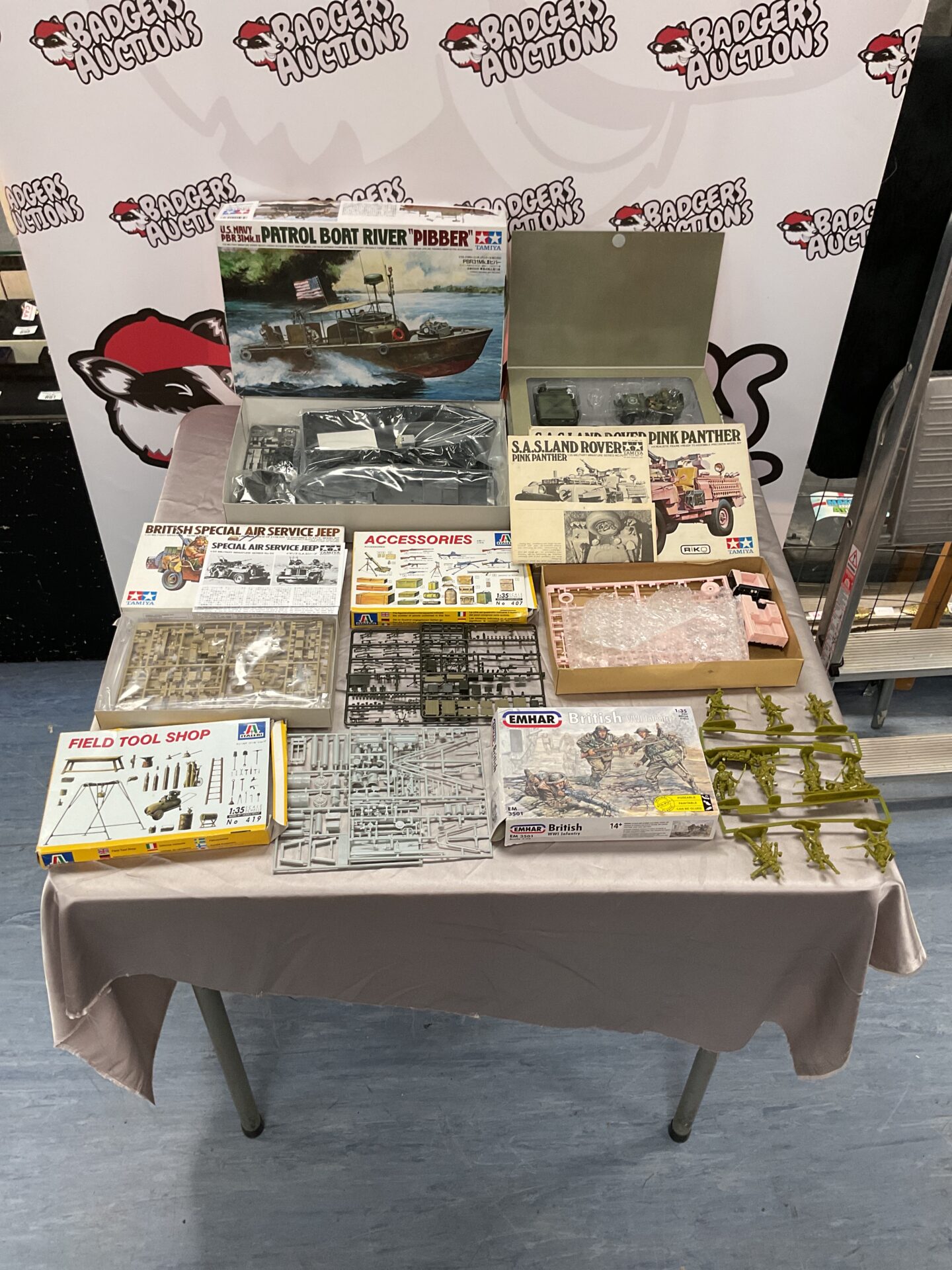 This lot features a diverse collection of unbuilt plastic model kits, including offerings from Tamiya and a 1/35 scale Jeep Willys RC model. Perfect for enthusiasts of military modelling and radio-controlled vehicles, these kits are in their original packaging and ready for assembly. A great addition to any collection or a fantastic starting point for a new hobby.