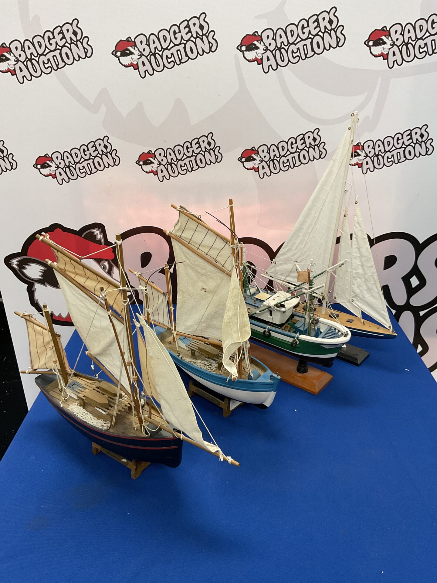 This lot comprises four miniature model sailing ships, each exhibiting unique design elements and construction. The ships feature detailed masts, sails, and hulls, suggesting a handcrafted or meticulously assembled origin. The varying sizes and styles of the ships indicate they may represent different historical periods or vessel types, making them a visually appealing collection for nautical enthusiasts.
