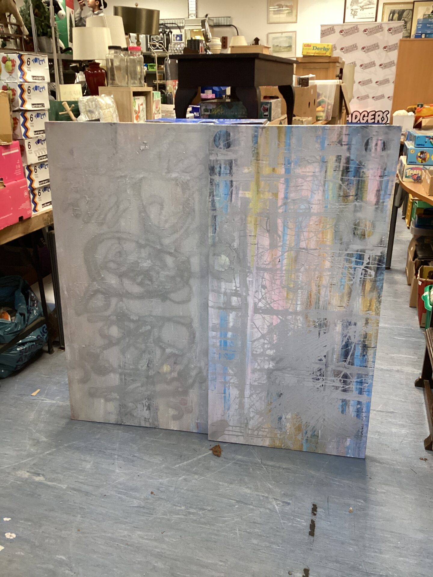 This lot comprises two modern art canvases, displaying abstract expressionist styles. The canvases feature bold brushstrokes and a vibrant colour palette, primarily consisting of blues, whites, and greys. These pieces evoke a sense of movement and depth, making them striking additions to any contemporary space.