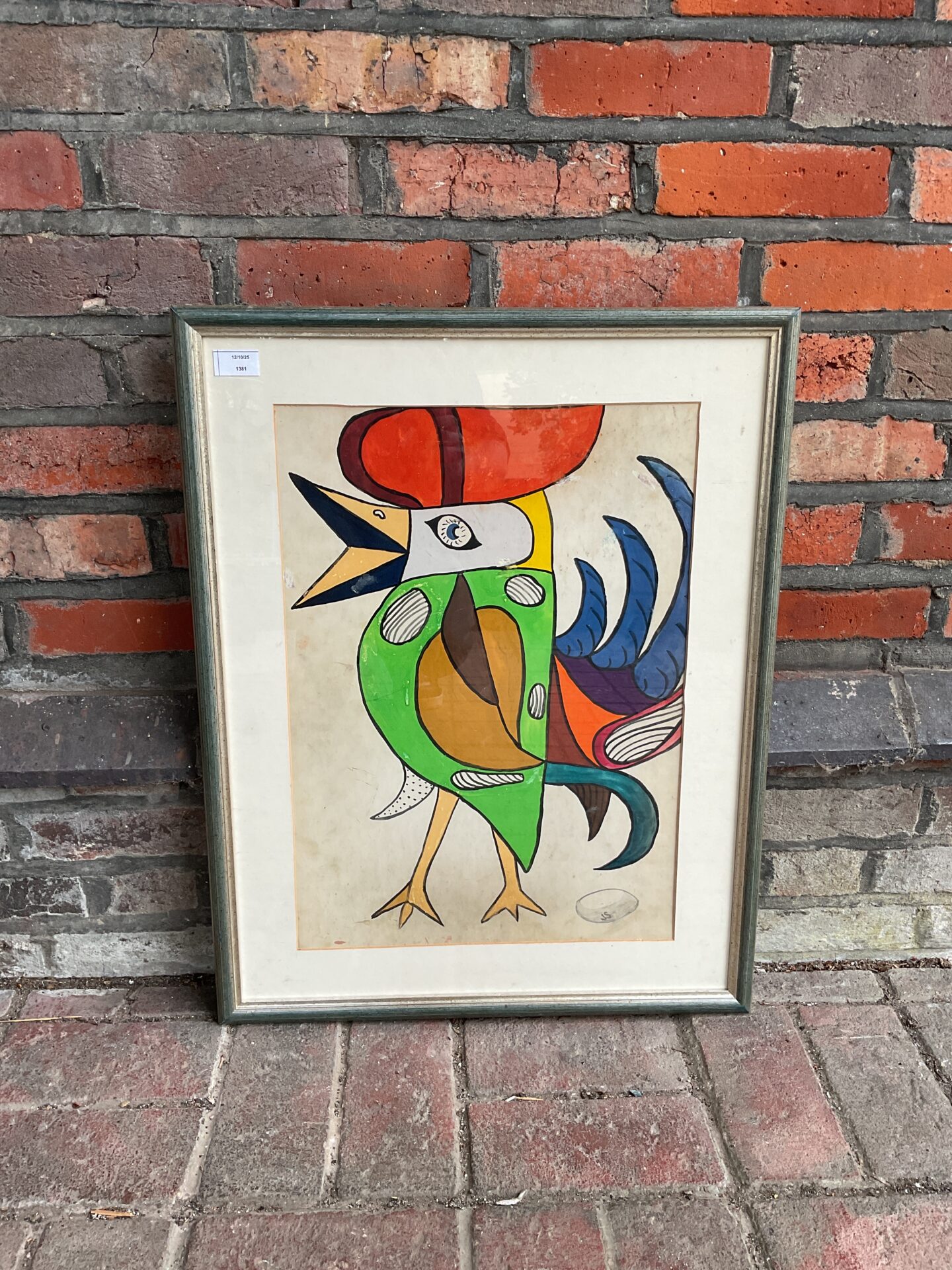 The watercolour is in good vintage condition, showing some expected signs of age which add to its character. The artwork appears to be original and would be a wonderful addition to a collection of modernist art, animal paintings, or folk art. Its vibrant colours and unique style make it a standout piece that is sure to attract attention and spark conversation.