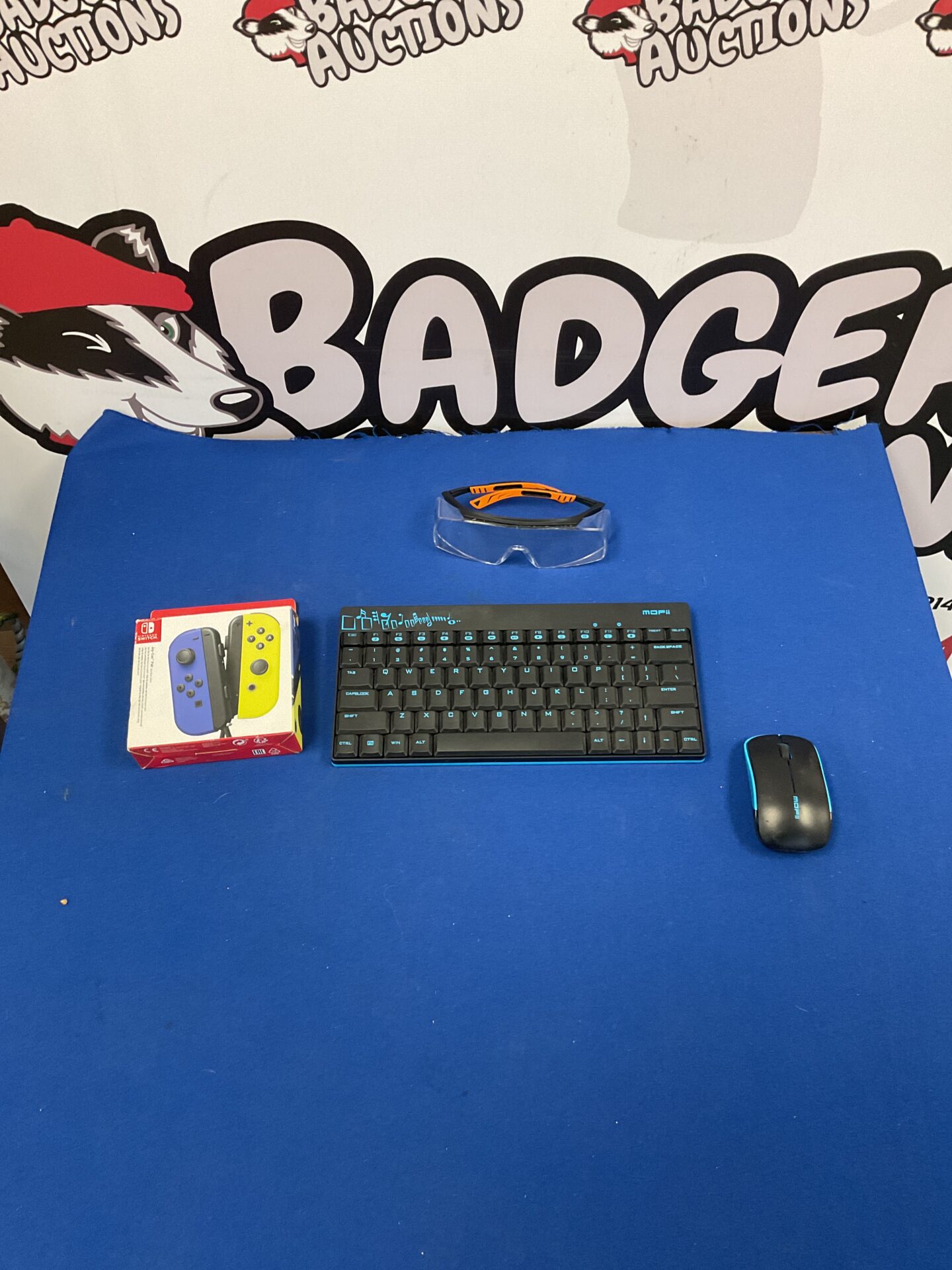 This lot features a Mofii X210 wireless keyboard and mouse set, designed for both computer use and compatibility with the Nintendo Switch. The keyboard boasts a compact layout, aiming for ergonomic comfort and efficient use of desk space. Included with the keyboard and mouse is a pair of Nintendo Switch Joy-Con controllers, offering a versatile setup for gaming on multiple platforms.