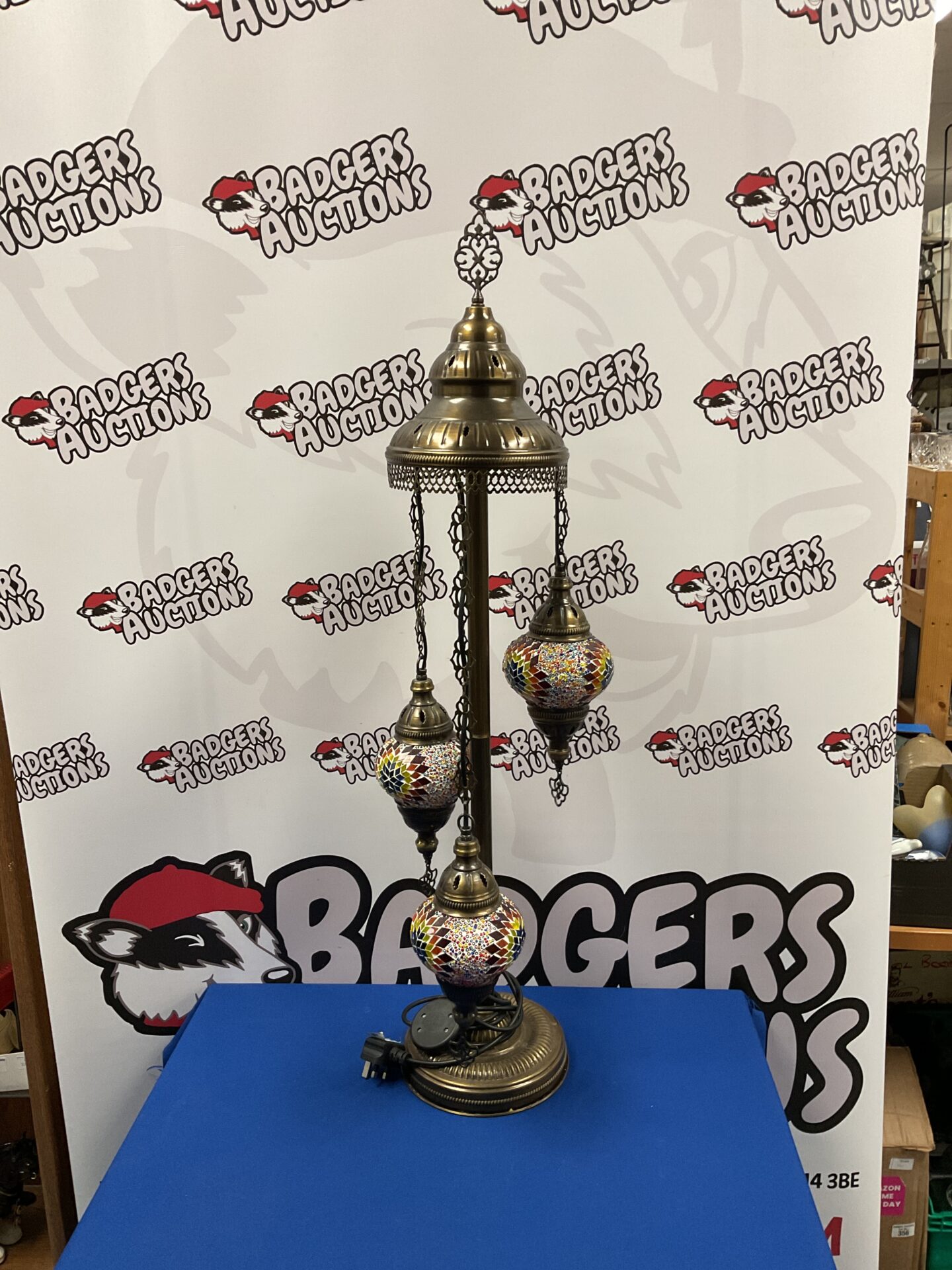The lamp presents with signs consistent with age and use, including minor imperfections in the mosaic and some patina to the metal base. These characteristics contribute to its vintage charm and authenticity. This lamp would be a striking addition to any collection of decorative lighting or a unique statement piece for those seeking to add a touch of exotic flair to their home.