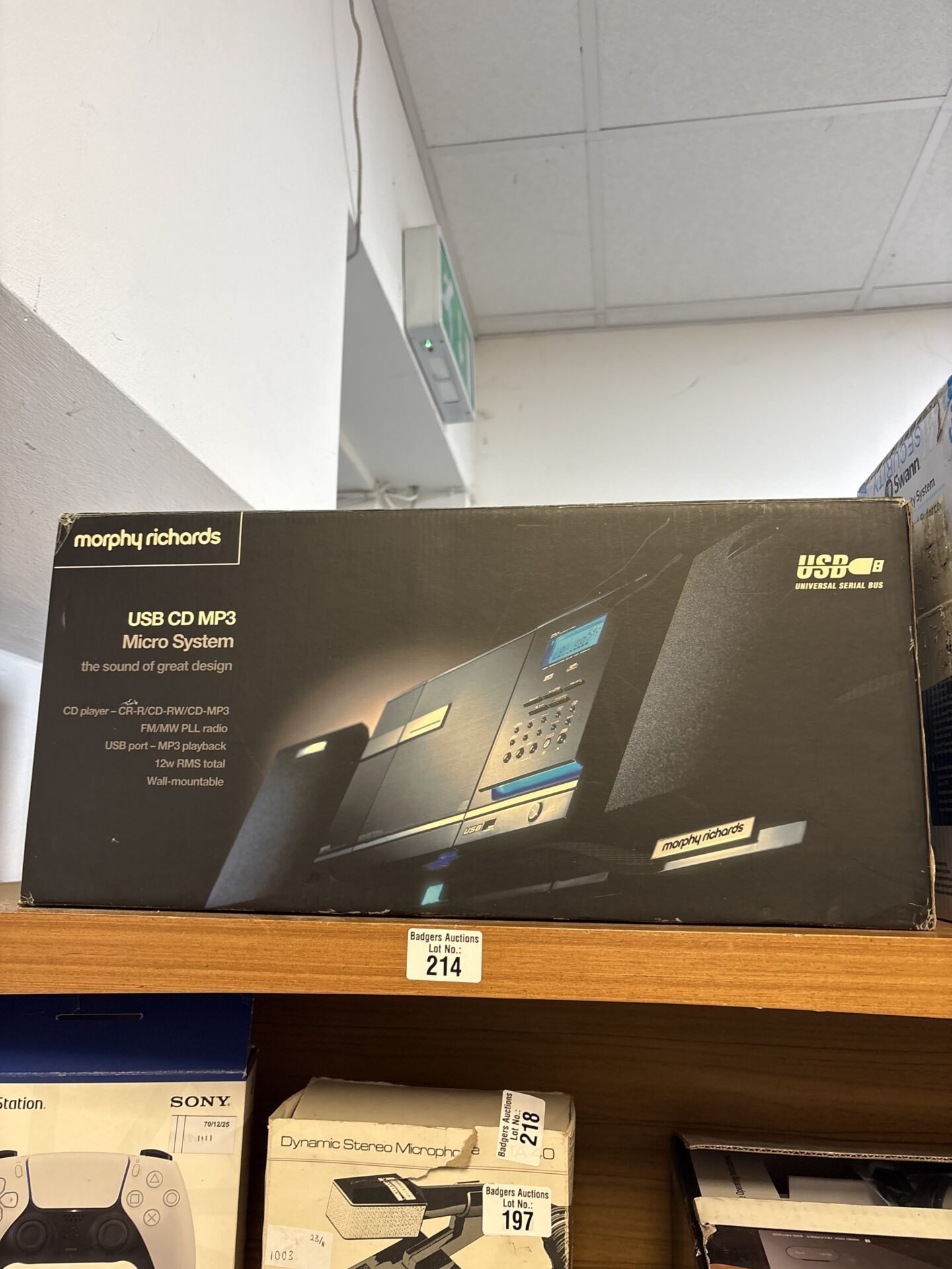 This is a Morphy Richards USB CD MP3 Micro System, designed for portable audio playback. The system features a CD player, compatibility with MP3 files, and a USB port for connecting external devices. It is a compact unit intended for ease of use and portability, offering a convenient way to enjoy music at home or on the go.
