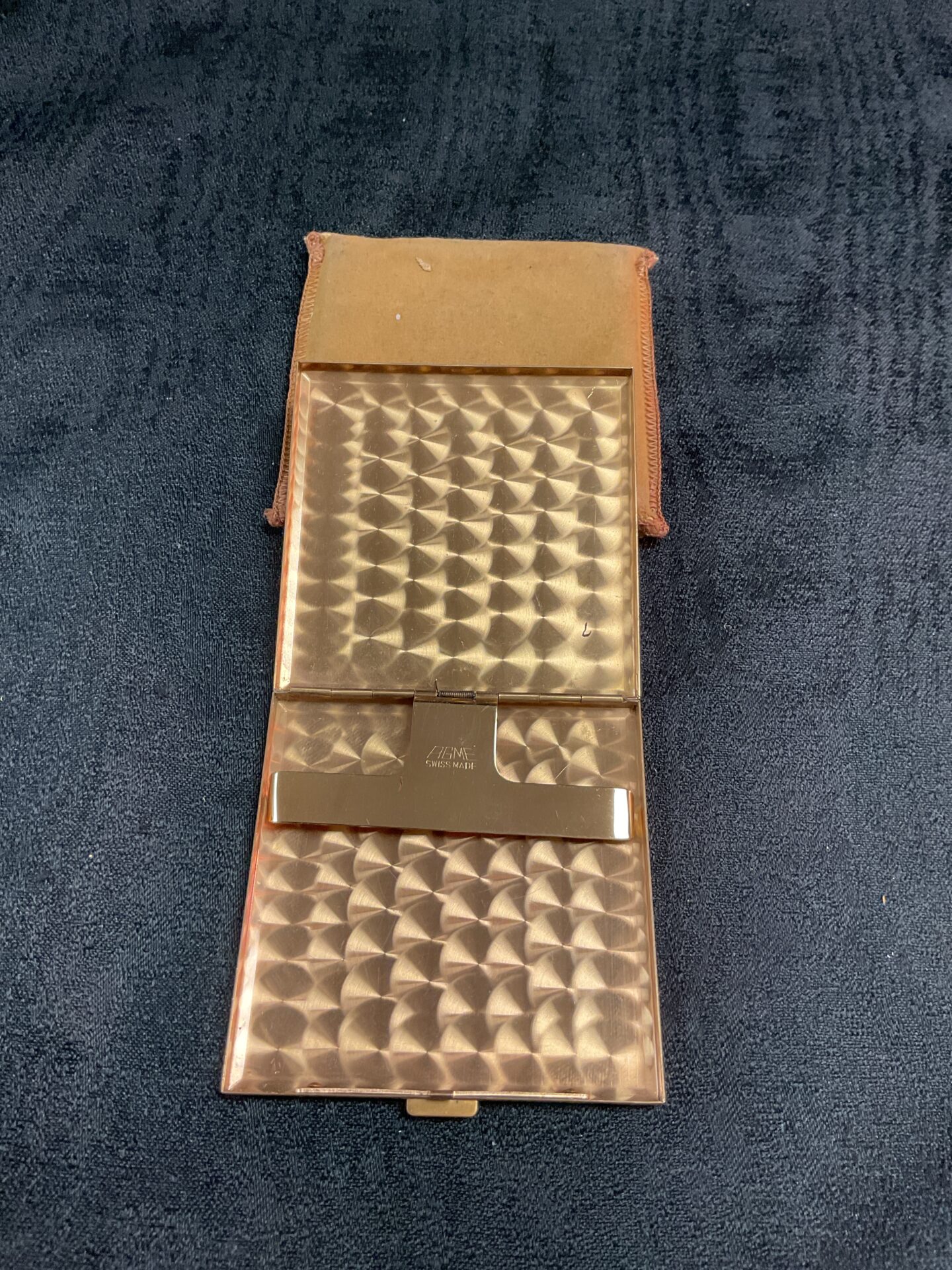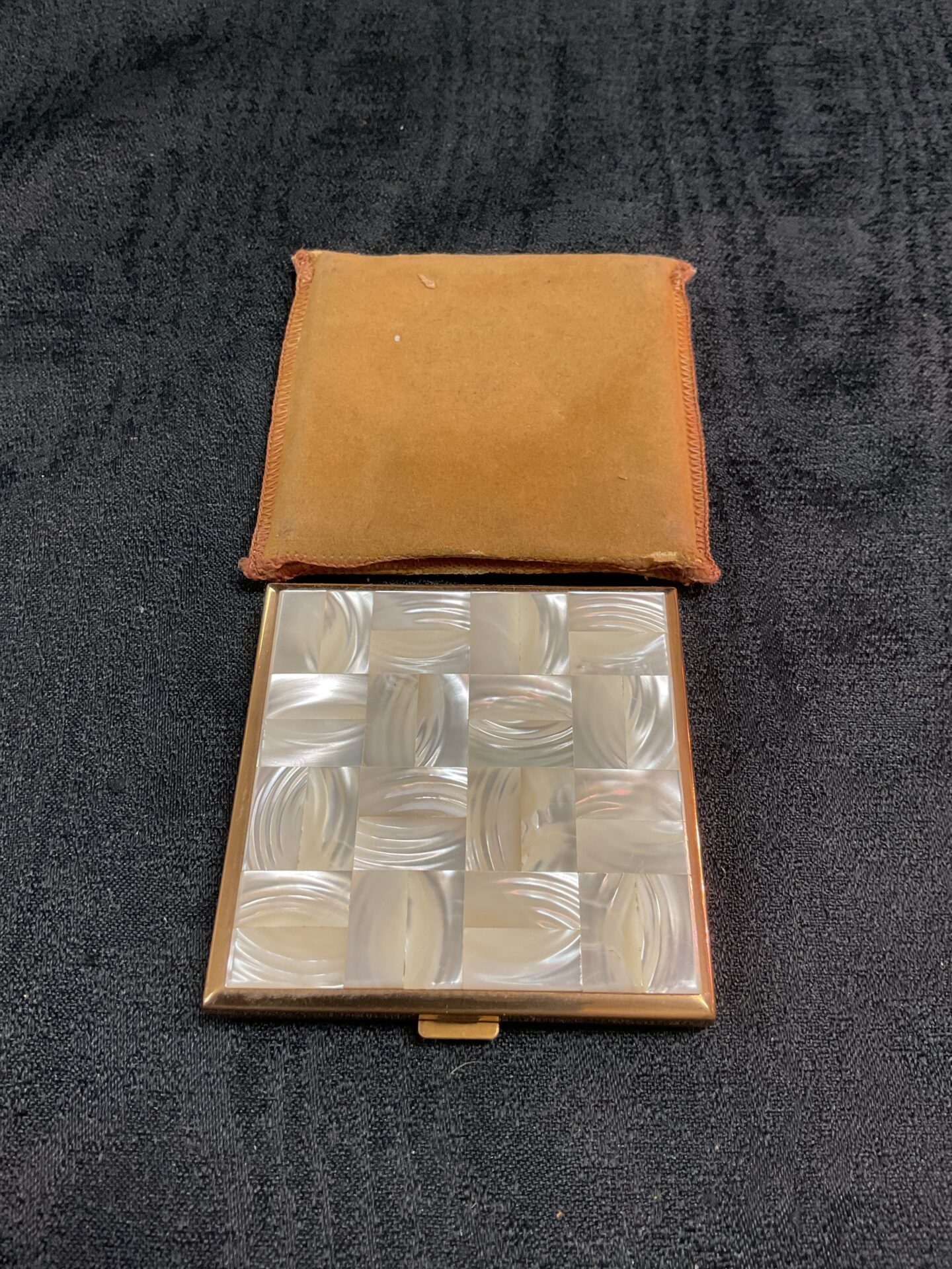 This vintage cigarette case features a beautiful mother of pearl inlay and is Swiss made by Agme. A classic Art Deco accessory, it’s in good vintage condition and perfect for collectors or those seeking a unique piece of history. This collectible case adds a touch of elegance to any collection.