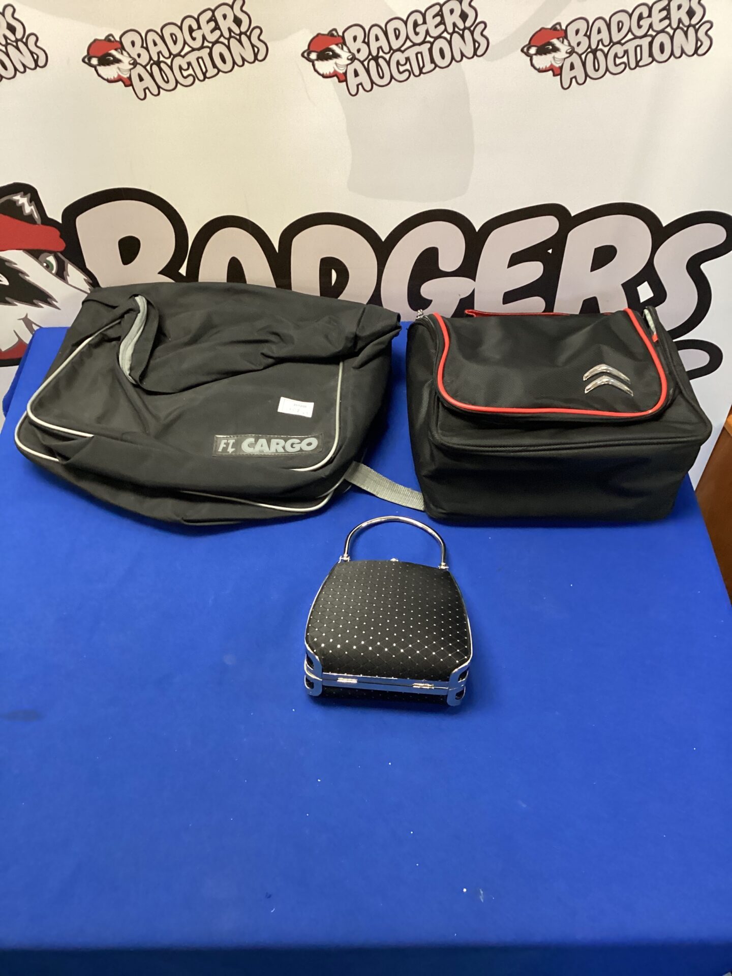 This lot comprises a pair of motorcycle panniers, a Citroen car valet bag, and a ladies’ clutch bag. The panniers appear to be constructed from a durable material, suitable for carrying items during motorcycle travel. The Citroen bag is a classic piece of automotive memorabilia, while the clutch bag offers a touch of vintage style.