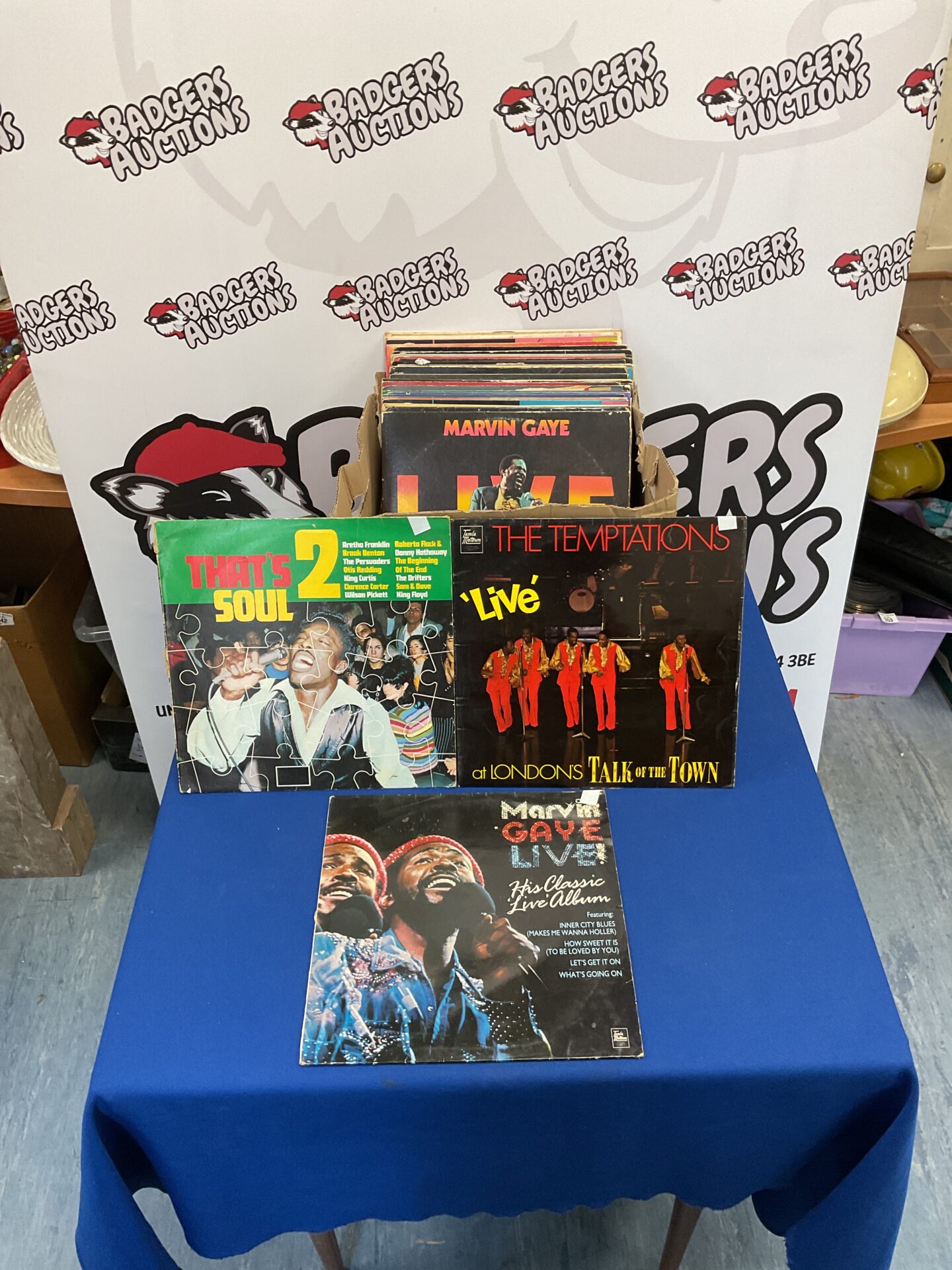 This is a collection of vintage LP records, primarily focusing on the Motown, Soul, and Jazz genres. The collection appears to include artists such as Marvin Gaye, and features classic albums from the era. These records represent a significant period in music history, showcasing the iconic sounds and artists that defined the genre.
