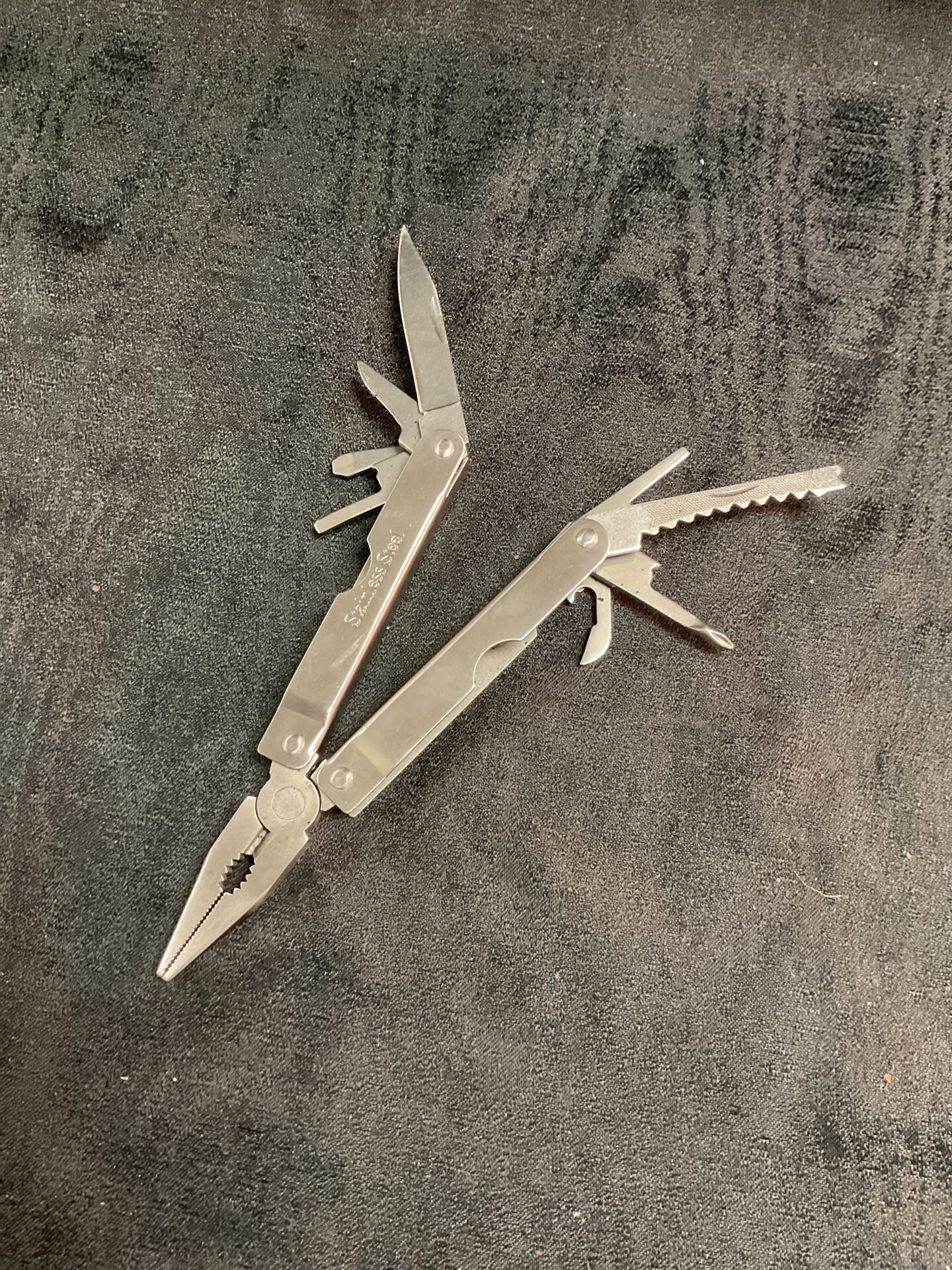 This multi tool exhibits signs consistent with use and age. Please examine the images carefully to assess its condition. It may be of interest to collectors of vintage tools or individuals seeking a functional, compact repair tool for outdoor activities or general use.