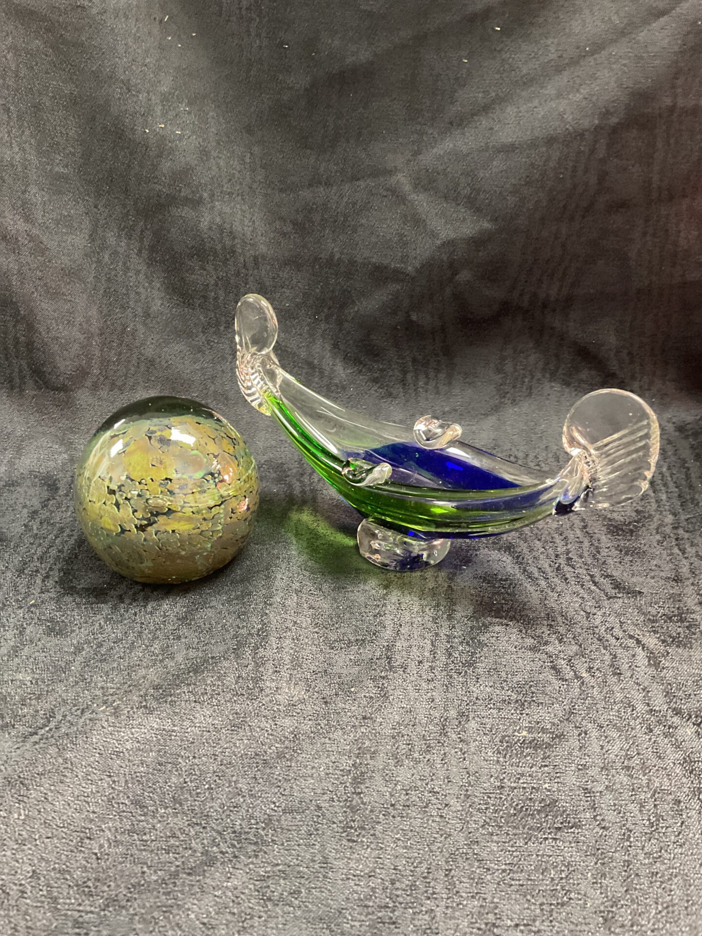 This Murano glass gondola appears to be in good condition, with no obvious cracks or significant damage. As a vintage piece, it may exhibit minor wear consistent with age and handling. This gondola is a desirable collectible for enthusiasts of Murano glass, Italian art, and nautical themes. Its unique design and craftsmanship make it a standout piece for any collection.
