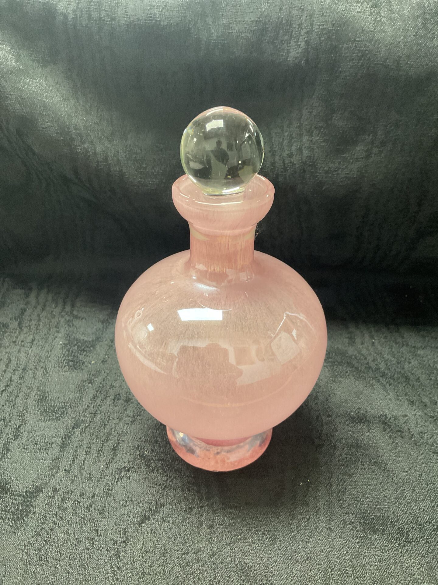 This exquisite perfume bottle is a stunning example of mid-century Murano glass artistry, crafted by the renowned Arcamedes Seguso. The bottle features a beautiful, soft pink hue, achieved through masterful glassblowing techniques. Its elegant, rounded form and delicate proportions exemplify the Italian glassmaker’s dedication to both aesthetic beauty and functional design. The bottle’s unique shape and colour make it a captivating piece of art, perfect for displaying or adding a touch of vintage glamour to any vanity.