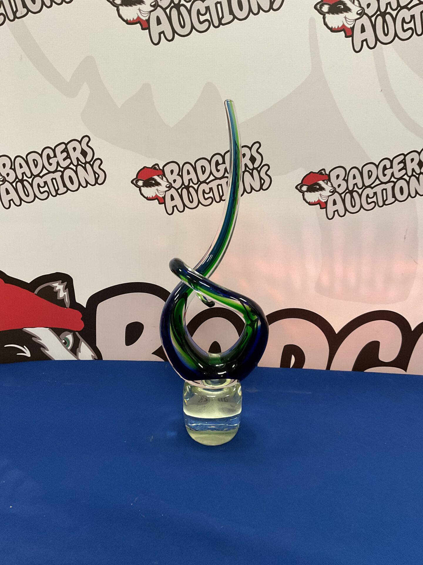 This striking sculpture is a beautiful example of Murano glass artistry. The piece features a freeform design with a clear glass base supporting a swirling blue glass form. The vibrant blue and clear glass create a dynamic contrast, showcasing the skill of the Murano glassblowers. Measuring approximately 15 inches in height, this sculpture is a statement piece for any collector or enthusiast of Italian glass art.