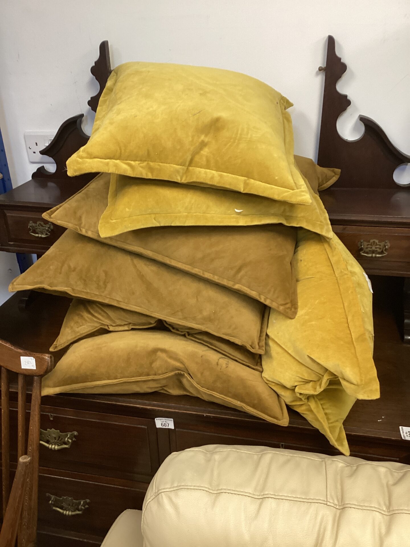 This lot features seven comfortable sofa cushions in a vibrant mustard yellow hue. Perfect for adding a pop of colour and comfort to any living space, these cushions are versatile and complement various interior styles. Ideal for home decor enthusiasts or those seeking to refresh their living room.