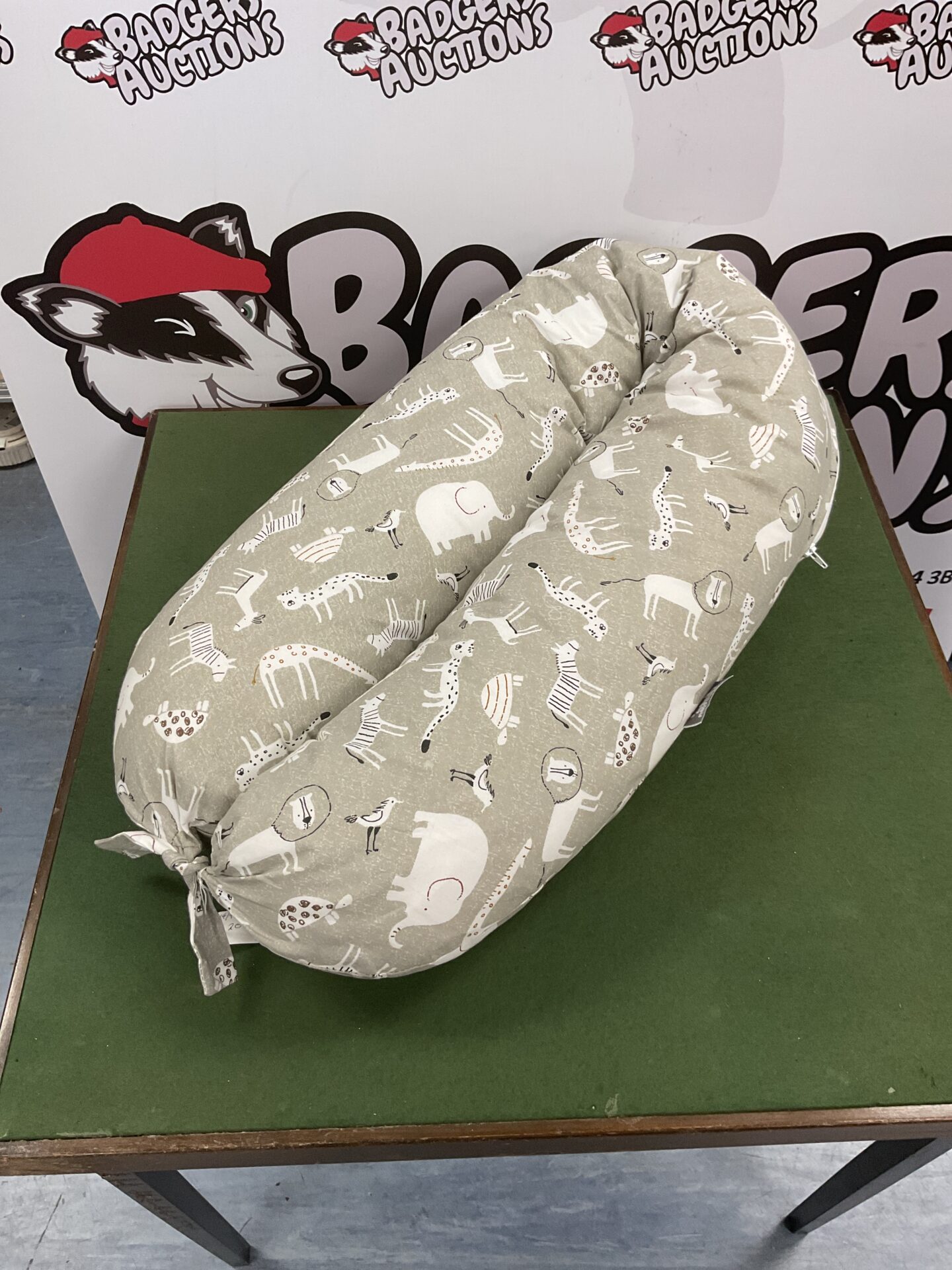 This is a large, cylindrical neck cushion featuring a charming animal print design. The cushion is predominantly grey with illustrations of elephants, giraffes, and other safari animals. It’s designed for comfort and support, ideal for travel, lounging, or as a decorative accent in a bedroom or living space. The long shape makes it versatile for supporting the neck, back, or other areas needing gentle cushioning.