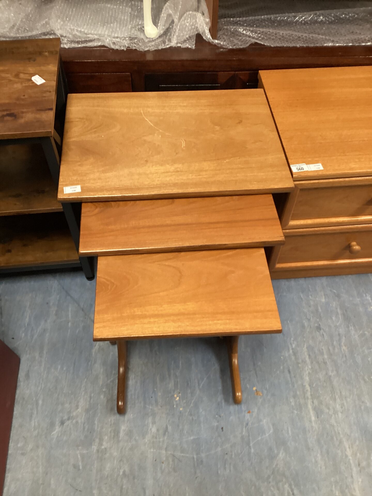 This set comprises three graduated wooden tables, designed to nest neatly within each other for space-saving storage. The tables exhibit a classic mid-century modern aesthetic, with clean lines and a warm wood tone. Their simple construction and functional design make them versatile additions to any living space, suitable for use as side tables, occasional tables, or display surfaces.