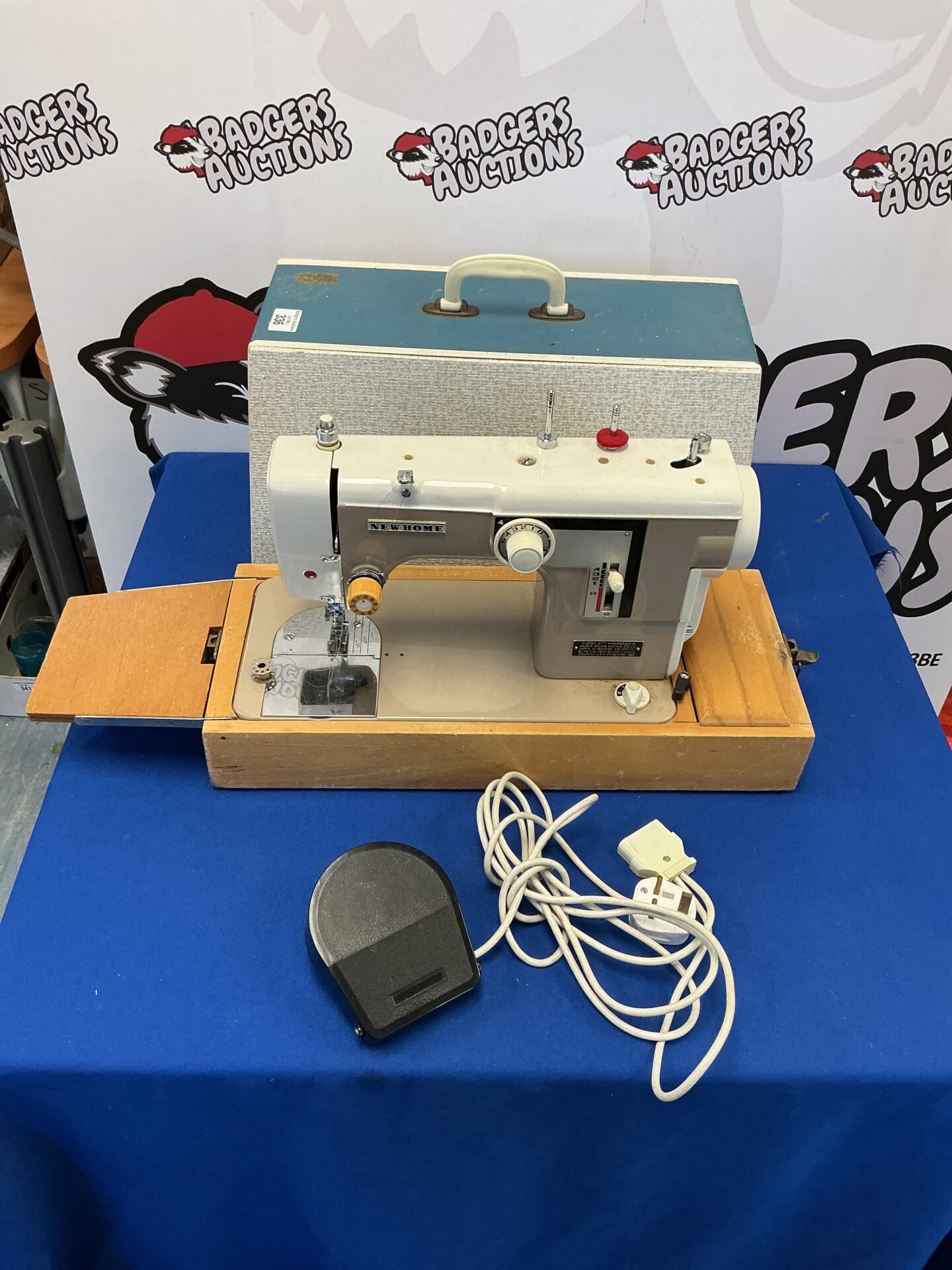 This is a classic New Home sewing machine, complete with its original carrying case. This portable machine is a testament to quality craftsmanship, designed for both home use and travel. The machine features a robust metal construction and a smooth operating mechanism, making it ideal for a variety of sewing projects. It’s a beautiful example of mid-century design, blending functionality with a stylish aesthetic.