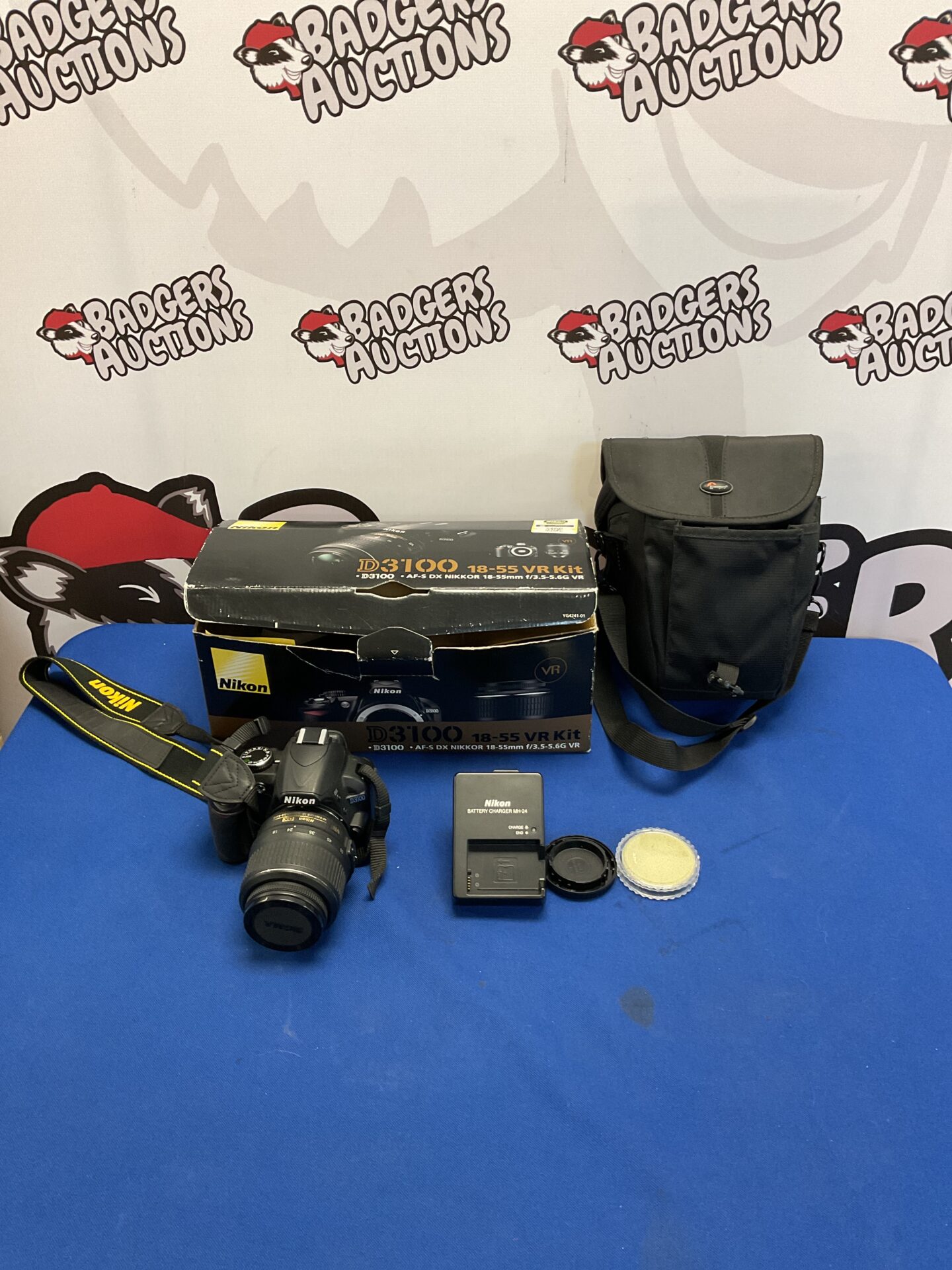 This is a Nikon D3100 digital SLR camera, part of Nikon’s popular D-series. It is a versatile camera designed for both beginners and enthusiasts, offering a balance of image quality, features, and ease of use. The kit includes an 18-55mm lens, providing a standard zoom range suitable for a variety of shooting situations, from landscapes to portraits.