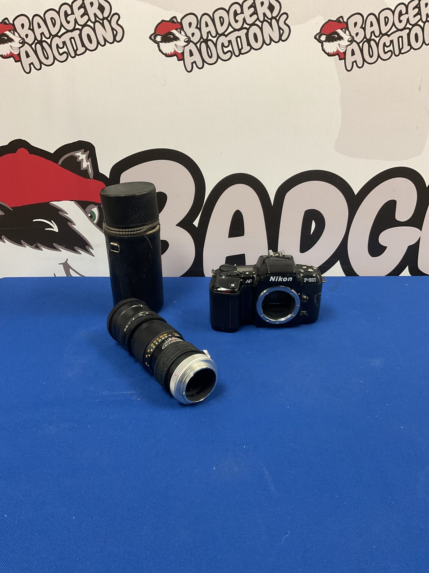 This is a Nikon F601 35mm film camera, paired with a Palinar telephoto lens, model number ST42560. The F601 is a popular entry-level SLR known for its ease of use and reliable performance. The Palinar lens offers a telephoto reach, suitable for capturing distant subjects.