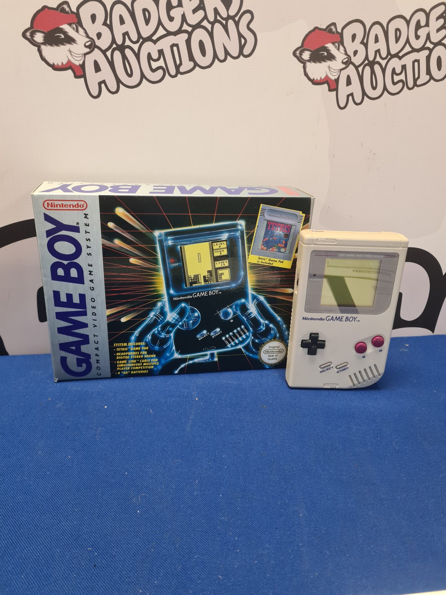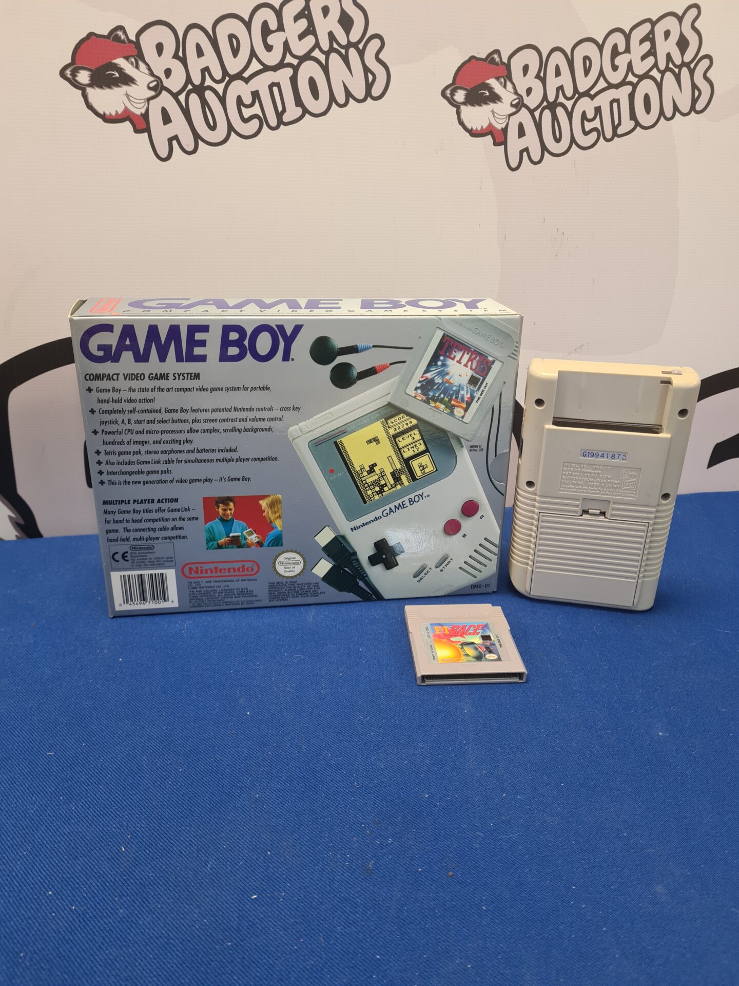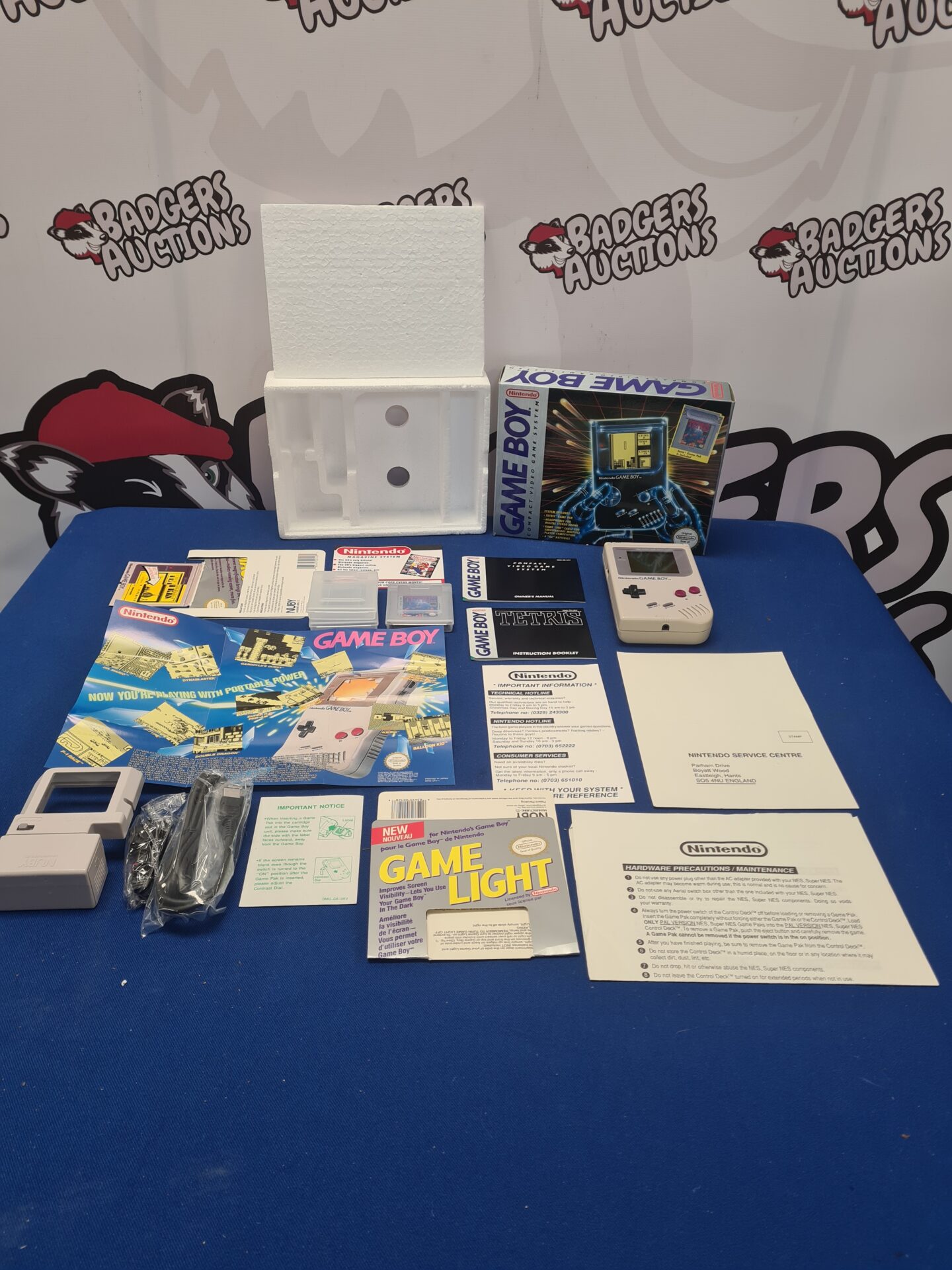 This Game Boy is presented with its original box, a selection of games, manuals, and a magnifier attachment. The condition of the unit and its accessories should be assessed by potential buyers, as no functionality is guaranteed. This set is of interest to collectors of retro gaming consoles, fans of the original Game Boy, and those seeking a nostalgic piece of gaming history.