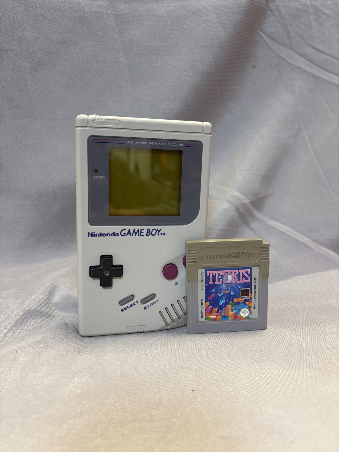 This is an original Nintendo Game Boy handheld console, accompanied by a Tetris game cartridge. Released in 1989, this grey handheld gaming system quickly became a cultural phenomenon, popularising portable gaming. The console features a dot matrix screen, directional pad, A and B buttons, start and select buttons, and a battery compartment. The included Tetris cartridge is one of the most iconic and best-selling video games of all time.