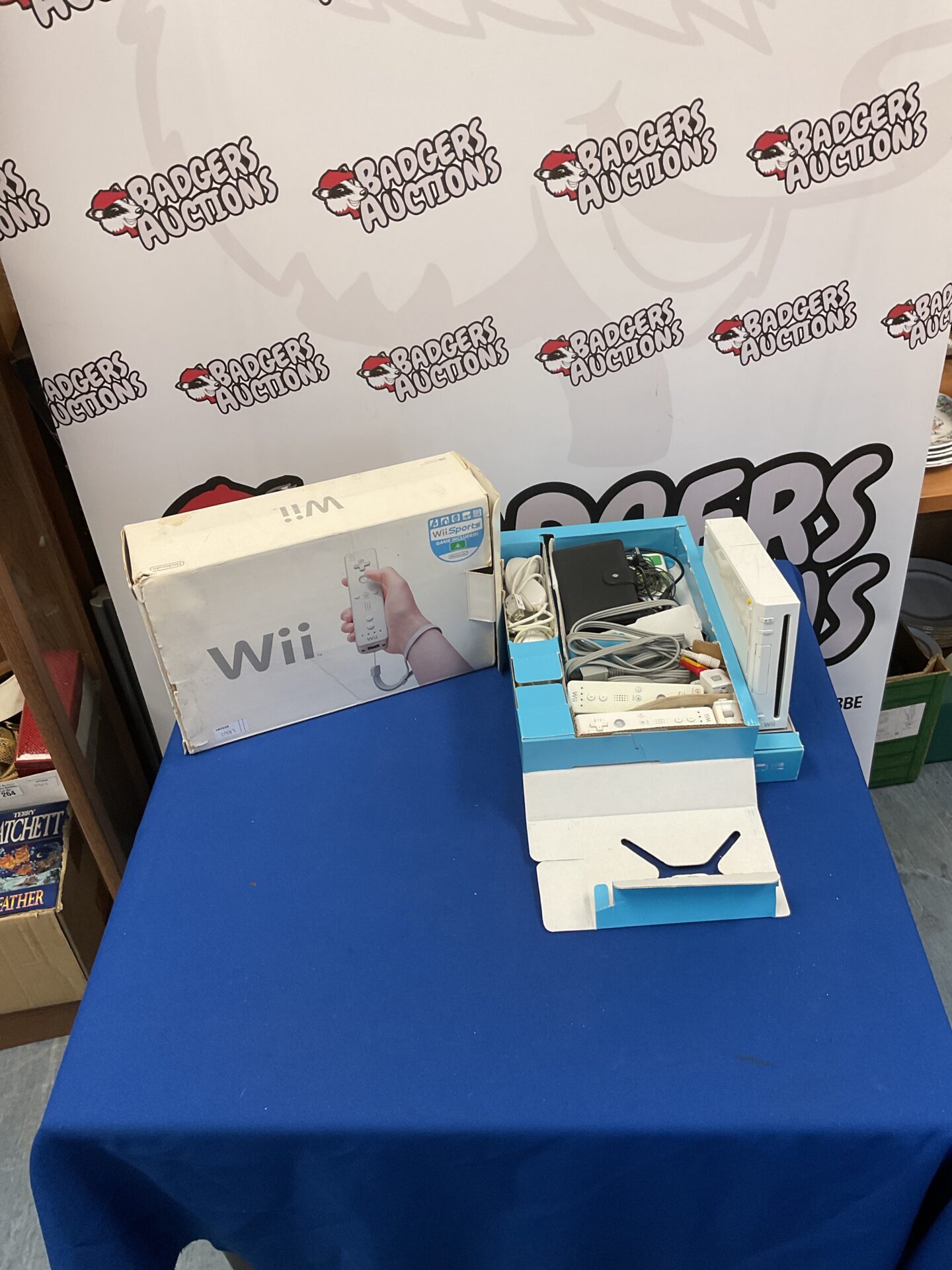 The console and its contents appear as presented in the images. This Nintendo Wii console may be of interest to collectors of retro gaming consoles, or those looking to revisit classic Wii titles. The presence of the original box adds to its appeal for collectors, and it represents a significant piece of gaming history.