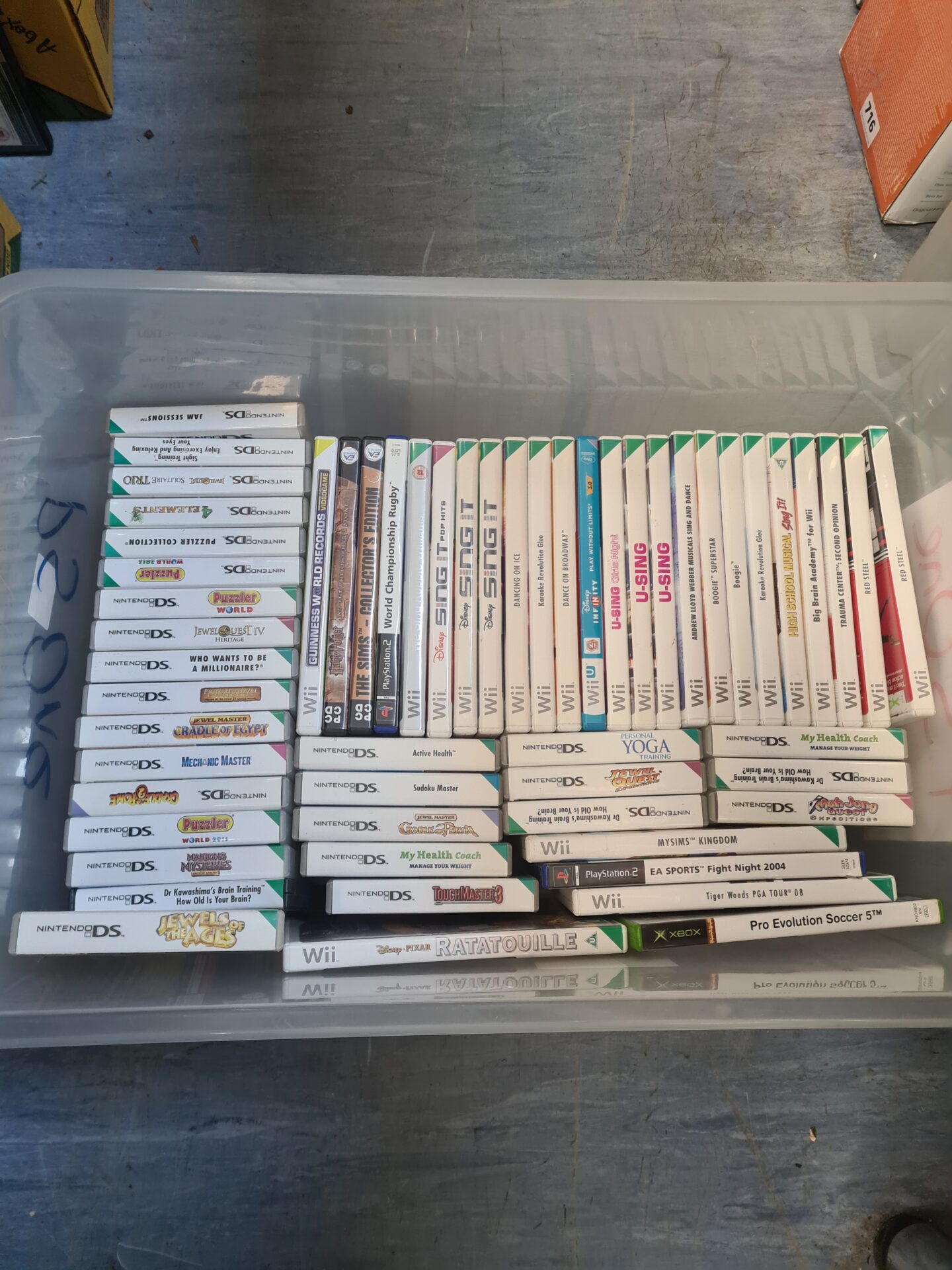 This lot comprises a collection of video games for various consoles, including Nintendo Wii, Playstation, Xbox, and Nintendo DS. The collection appears to include a variety of titles and genres, offering a diverse selection for gaming enthusiasts. The games are housed within a cardboard box, suggesting a collection amassed over time.