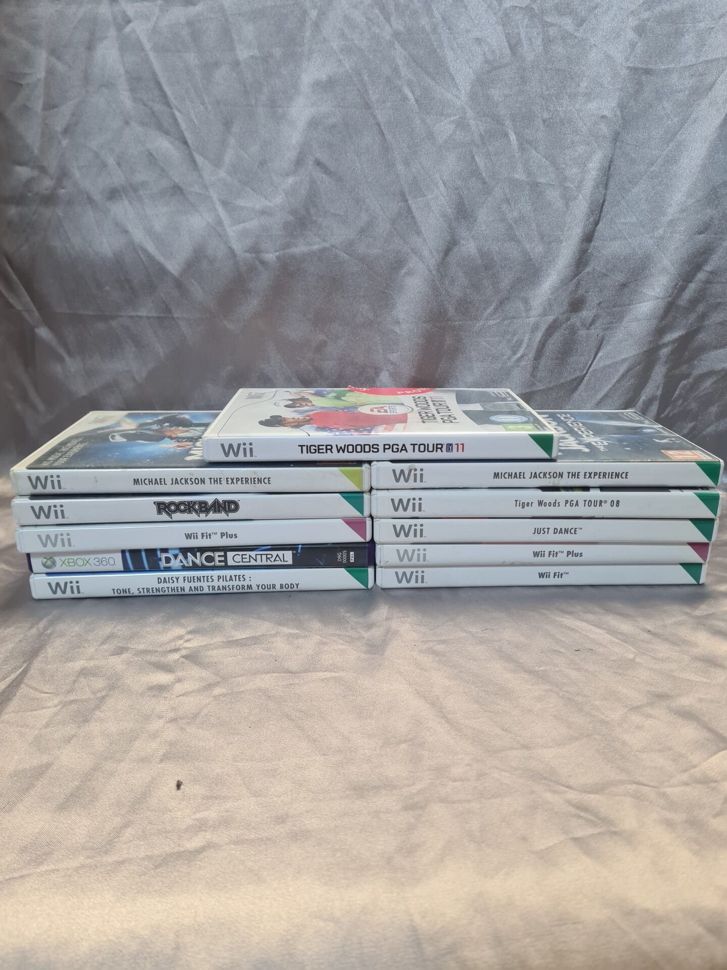 This lot features a selection of Nintendo Wii video games, alongside one Xbox 360 title. The collection includes a variety of genres, offering a diverse gaming experience. The games appear to be original releases, reflecting the popular titles of the Wii and Xbox 360 eras.