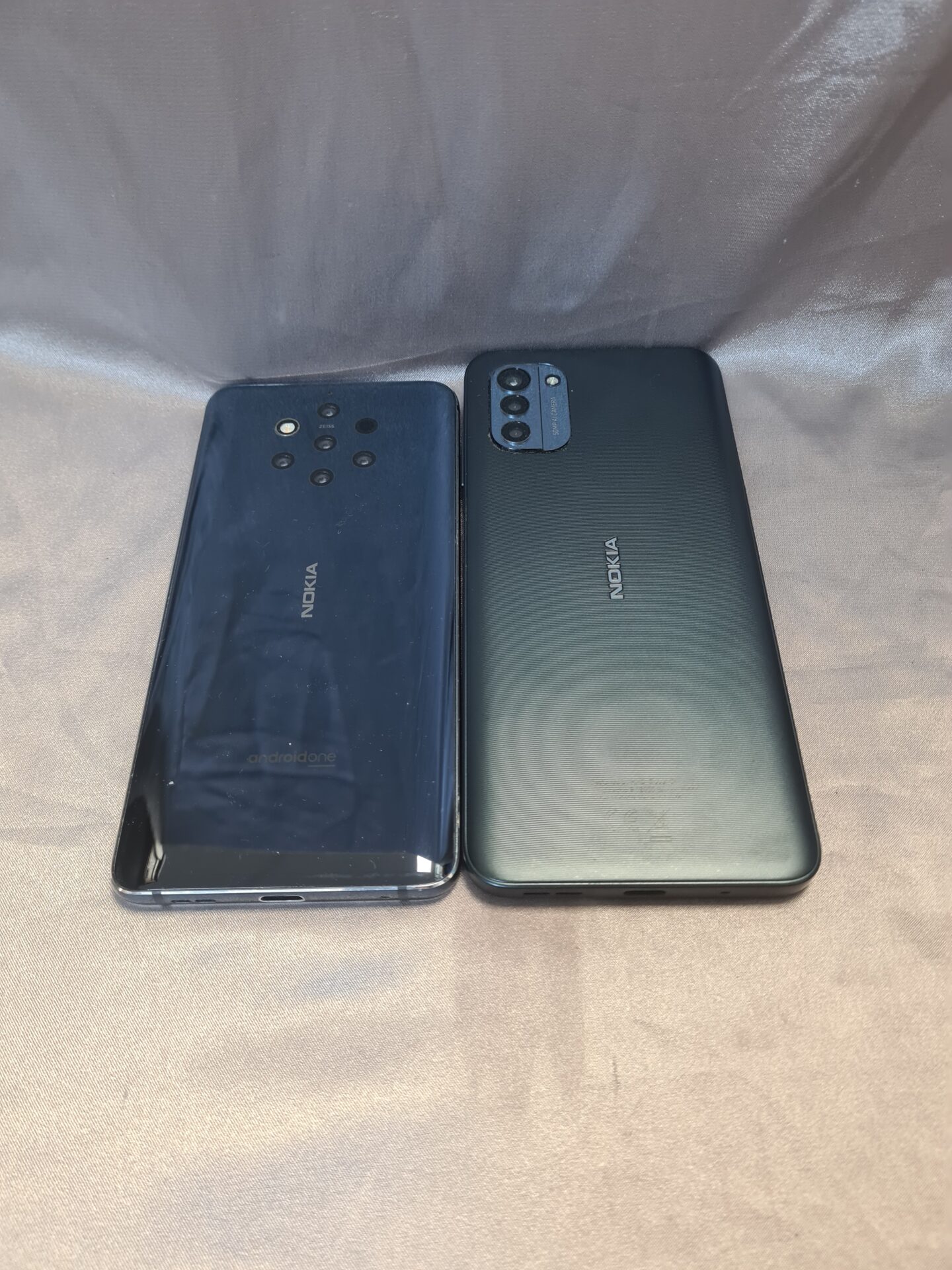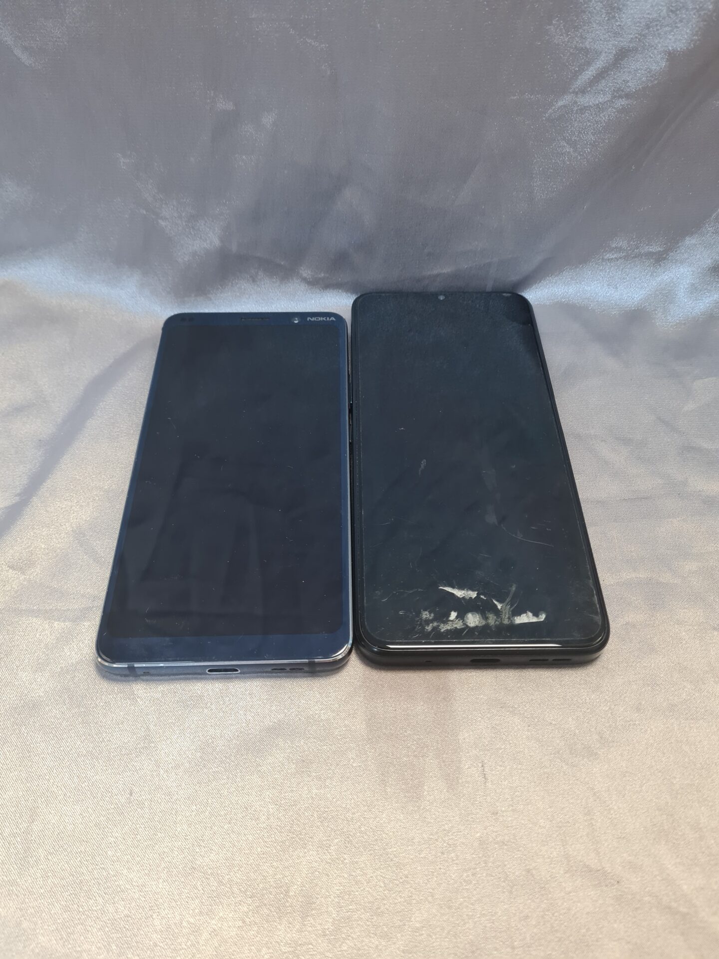 This lot comprises two Nokia mobile phones, showcasing the brand’s design aesthetic. The phones exhibit differing camera arrangements on the rear casing, with one featuring a circular arrangement and the other a more linear configuration. Both handsets display the Nokia branding prominently on the rear.