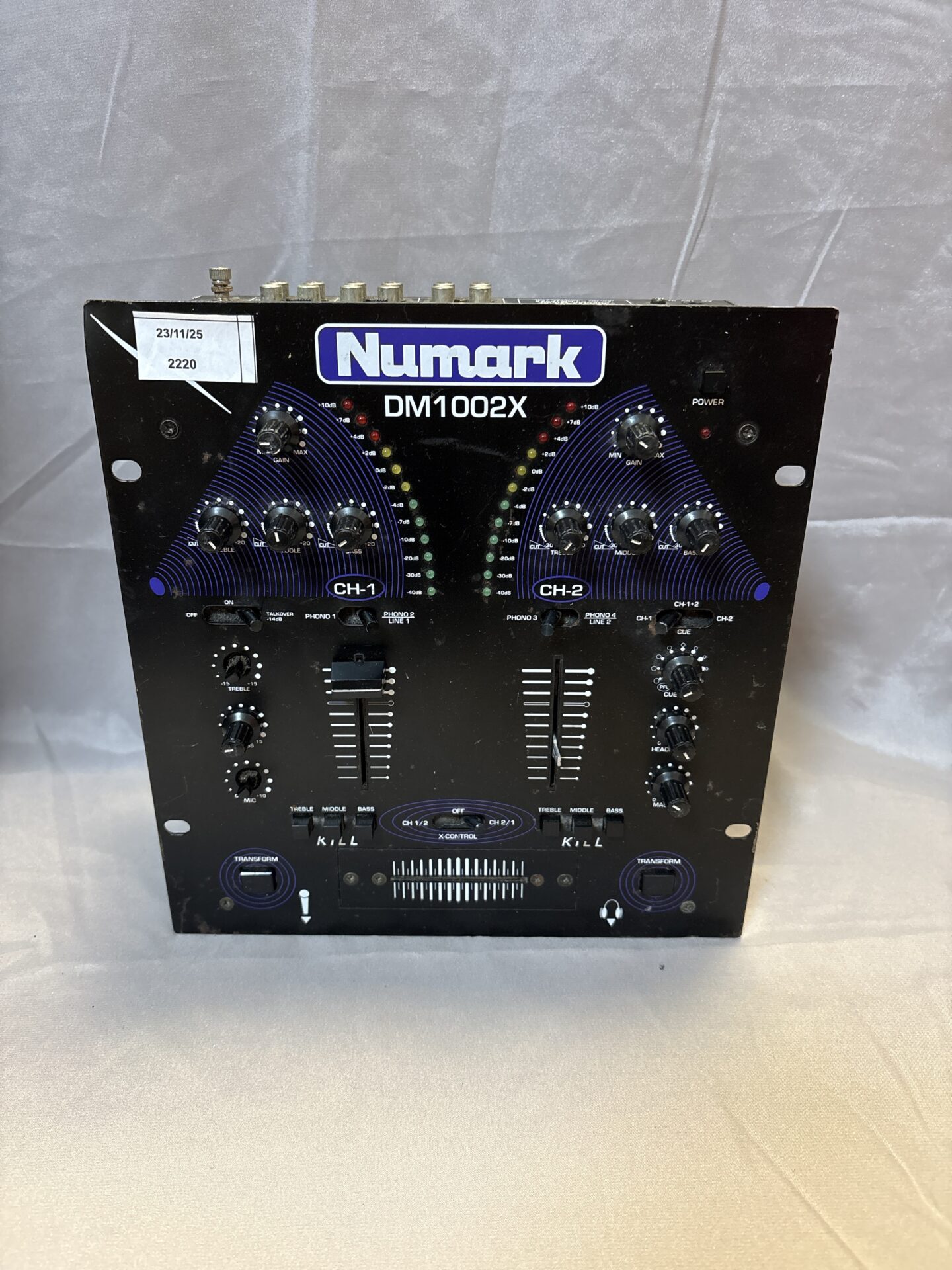 This is a Numark DM1002X professional mixer, designed for audio enthusiasts and DJs. Featuring a robust build and a classic layout, this mixer offers versatile control over audio signals. It boasts multiple input and output options, allowing for seamless integration with various audio sources and amplification systems.