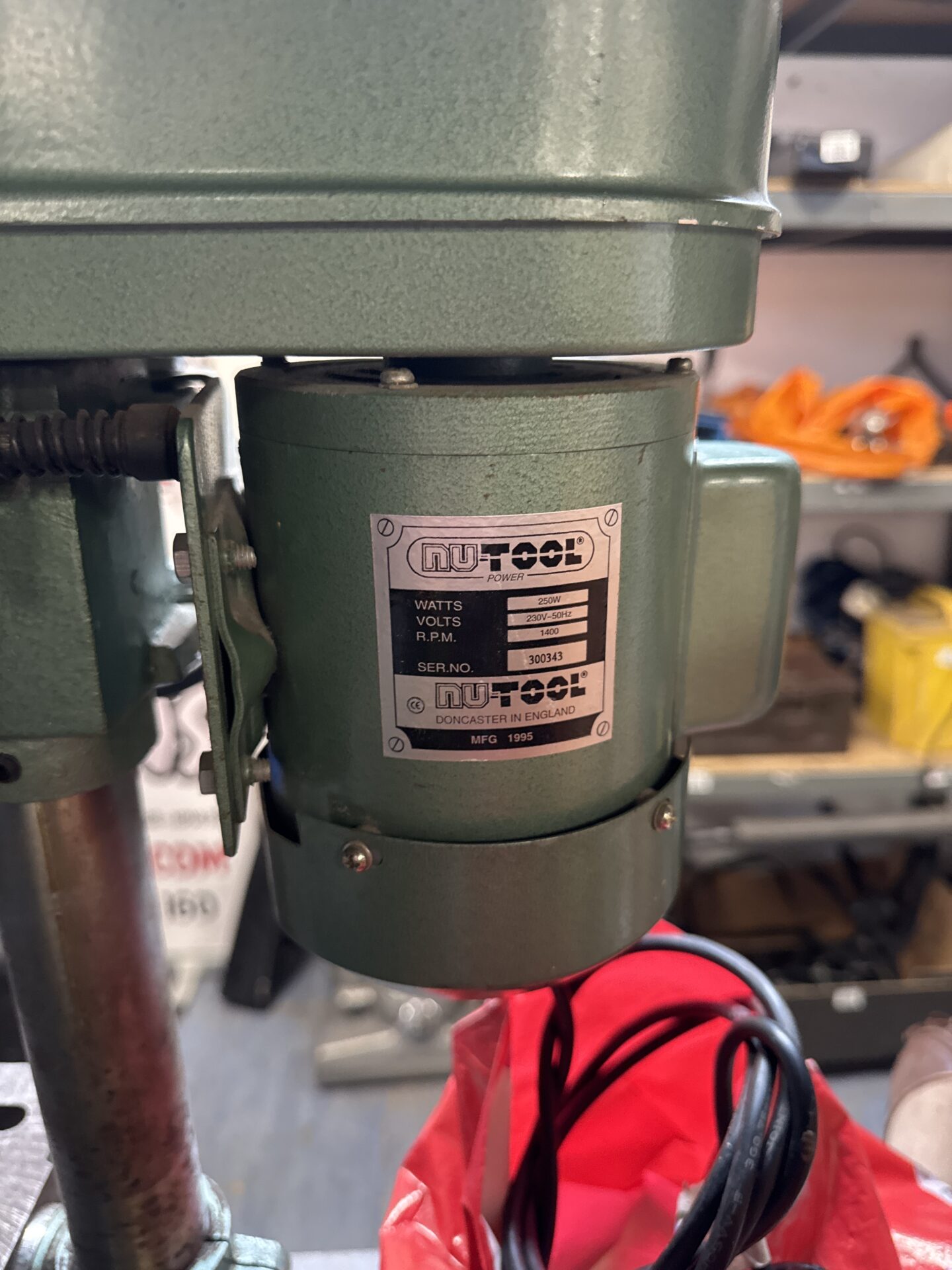 This is a Nutool pillar drill, a robust and reliable machine designed for metalworking and drilling tasks. Manufactured in Doncaster, England, this drill features a 250W motor and is capable of handling a variety of materials. The green finish and classic design give it a vintage aesthetic, while its functional build ensures it remains a practical addition to any workshop.