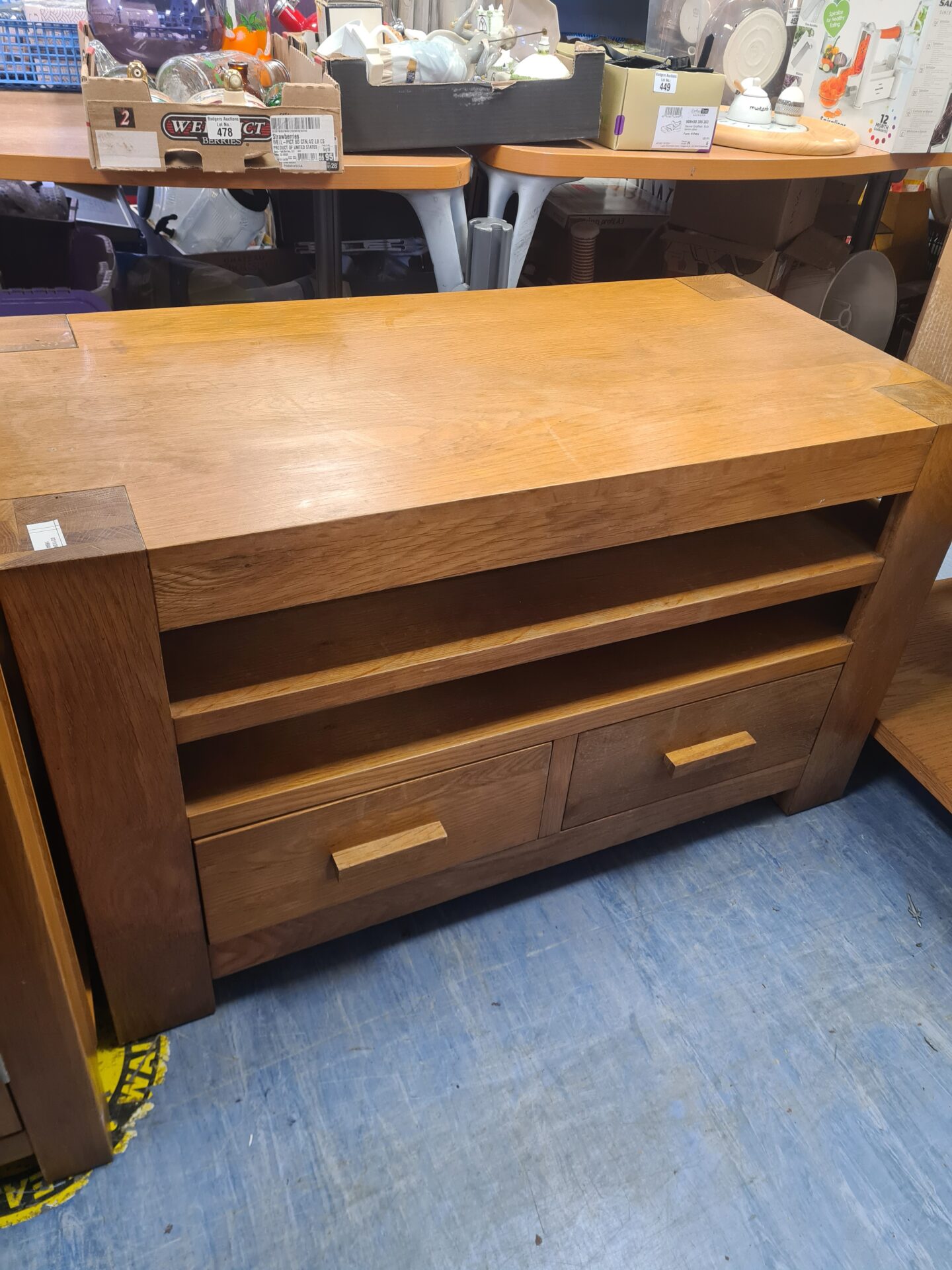 This is a solid oak media cabinet, constructed from robust timber. The cabinet features a clean, classic design, suitable for a variety of interior styles. It offers ample storage space with its cabinet doors and drawers, making it ideal for housing media equipment, records, or other living room essentials.