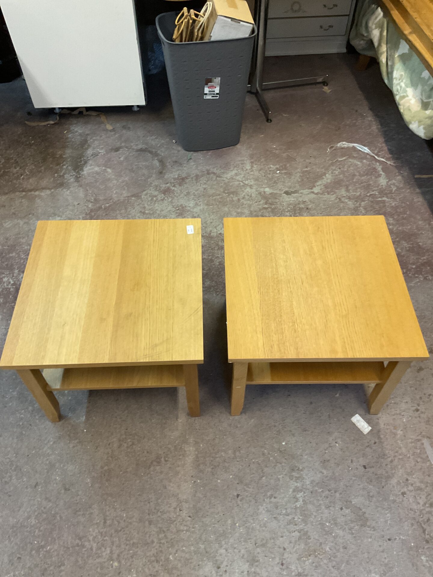This lot comprises two matching occasional tables, constructed from wood. Their simple, clean lines suggest a mid-century modern aesthetic, making them versatile additions to various interior styles. The tables feature a square tabletop and four legs, providing a stable and functional surface for lamps, books, or decorative items.
