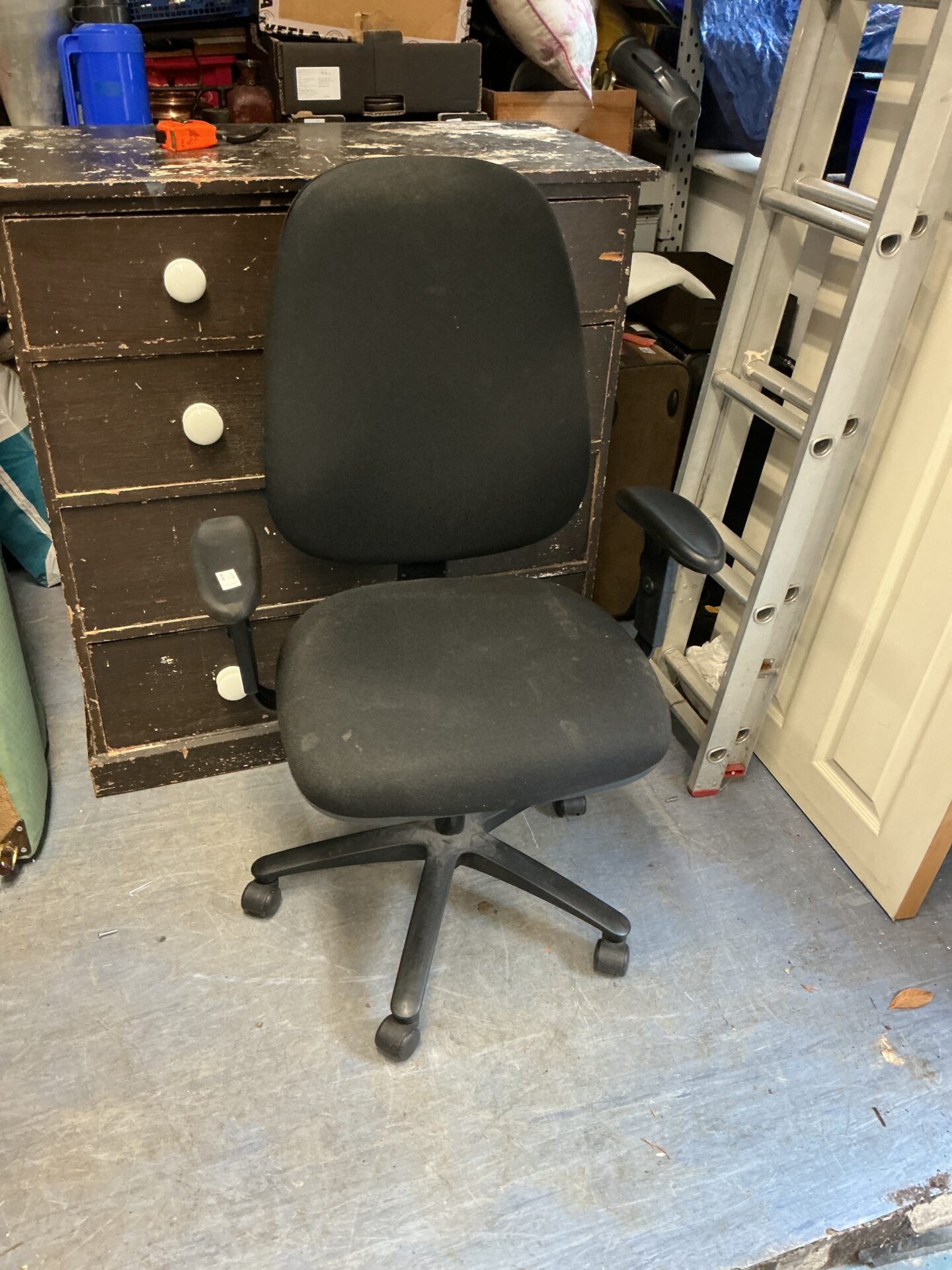 This chair shows signs of use and wear, consistent with its age and previous use. It may exhibit scuffs, marks, or fading on the upholstery and frame. Despite this, it remains a functional piece that could be suitable for a home office, workshop, or as a project for restoration.